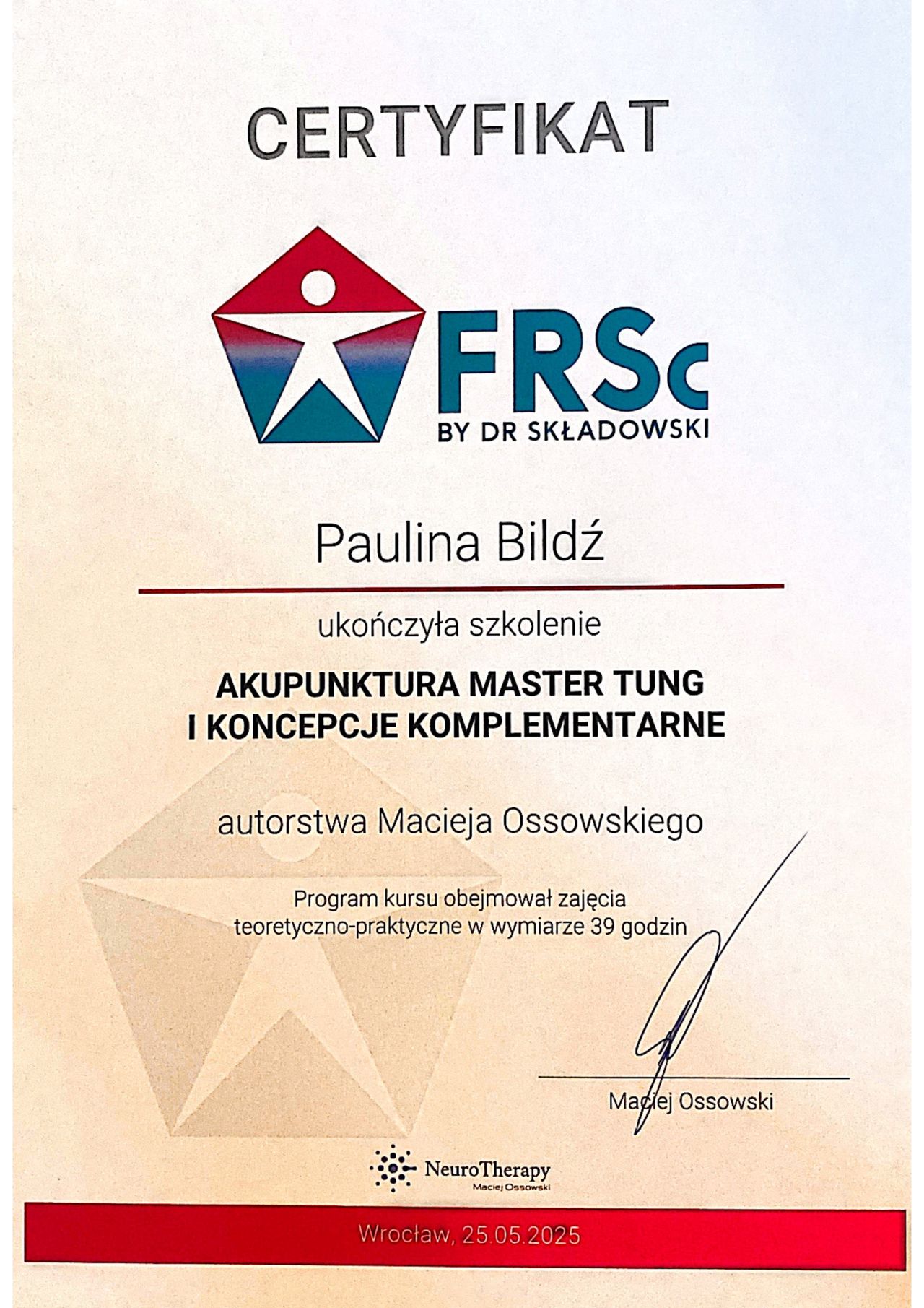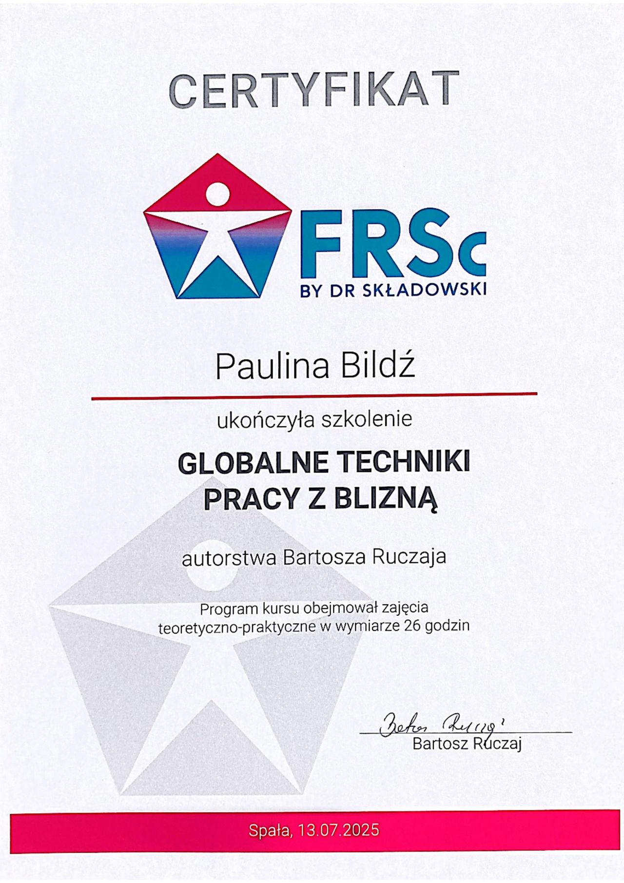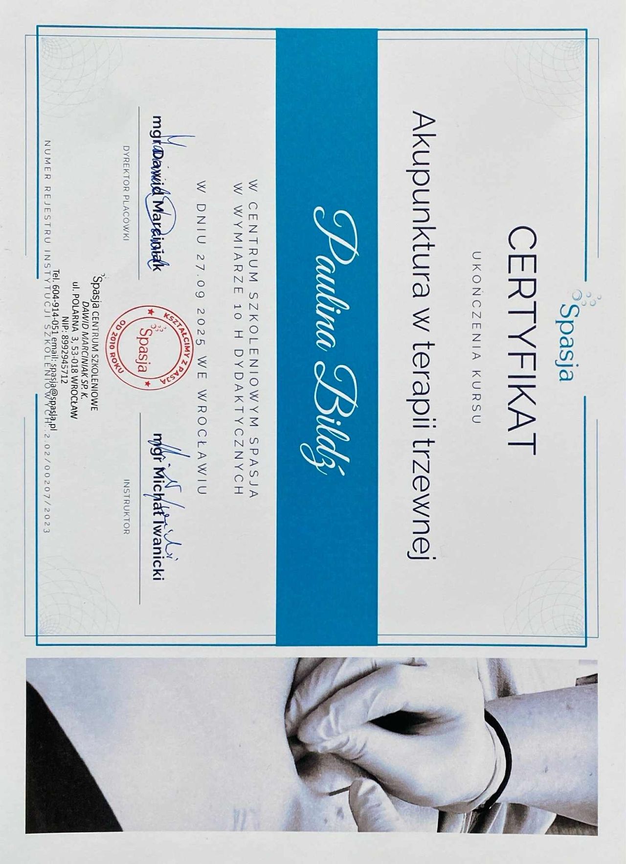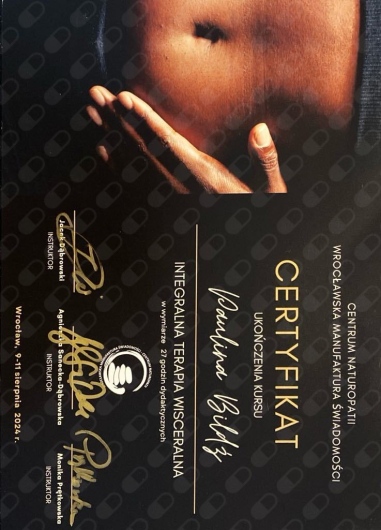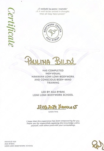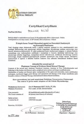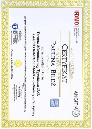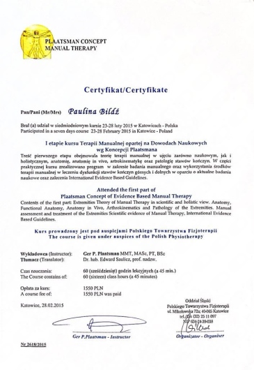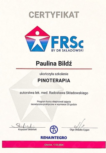 Paulina Bildź - magister fizjoterapii. Absolwentka Akademii Wychowania Fizycznego we Wrocławiu. Terapeutka manualna - w swojej pracy wykorzystuje pracę na tkankach miękkich, masaż tkanek głębokich, pinoterapię wg metody FRSc, akupunkturę, terapię wisceralną oraz elementy terapii czaszkowo-krzyżowej. Ukończyła również szkolenia z terapii manualnej wg Plaatsmana, czy też z metody FDM. W ostatnim czasie fascynuje się i szkoli z terapii wisceralnej (terapia narządów wewnętrznych, Starosłowiański masaż brzucha) i psychosomatyki. Wykonuje również różnego rodzaju masaże: od relaksacyjnych, przez klasyczne i sportowe, czy też masaż Lomi-Lomi Bodywork. Doszkalała się również z masażu balijskiego podczas pobytu w Indonezji. Swoje doświadczenie zdobywała w kilku wrocławskich drużynach sportowych, prywatnych gabinetach fizjoterapii, SPA, oraz z pacjentami z hospicjum. Specjalizuje się w walce z dolegliwościami bólowymi w obrębie układu kostno-stawowego i mięśniowego, oraz w zwalczaniu dysfunkcji narządów jamy brzusznej. Zakres usług: - Terapia manualna - Terapia wisceralna - Akupunktura - Masaż leczniczy - Masaż klasyczny - Masaż relaksacyjny - Masaż sportowy - Masaż balijski - Masaż lomi-lomi - Masaż kobiet w ciąży - Kinesiotaping - Klawiterapia - Pinoterapia - Kinezyterapia - Terapia bólu przewlekłego - Terapia blizny