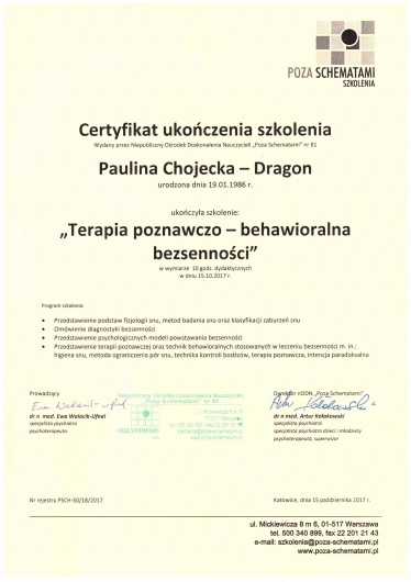Jestem psychologiem, pedagogiem i certyfikowaną psychoterapeutką poznawczo-behawioralną (PTTPB nr 1429), członkinią Polskiego Towarzystwa Terapii Poznawczej i Behawioralnej. Jestem absolwentką Psychologii Stosowanej na Uniwersytecie Jagiellońskim. Dodatkowo ukończyłam Szkołę Psychoterapii Poznawczo - Behawioralnej pod kierownictwem dr hab. Agnieszki Popiel i dr Ewy Pragłowskiej na Uniwersytecie SWPS w Katowicach. Ukończyłam całościowe szkolenie z Terapii Schematów akredytowane przez ISSt (International Society Of Schema Therapy).