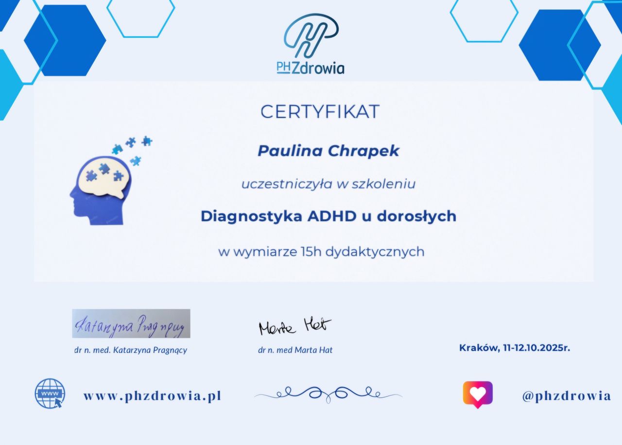 Czy Paulina Chrapek przyjmuje online, bez konieczności pojawiania się w placówce?Tak, Paulina Chrapek oferuje konsultacje online. Wybierz opcję „konsultacja online” przy umawianiu wizyty, a zobaczysz dostępne terminy.