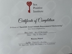 Dyplom Psychologa w specjalności psycholog kliniczny uzyskałam na wrocławskim wydziale Uniwersytetu SWPS. Seksuologiczne uprawnienia zdobyłam na poznańskim wydziale Uniwersytetu SWPS na kierunku seksuologia praktyczna. Ukończyłam I stopień szkolenia Terapii Skoncentrowanej na Rozwiązaniach oraz szkolenie zaawansowane II stopnia w warszawskim Centrum TSR, rozpoczęłam proces certyfikacji.