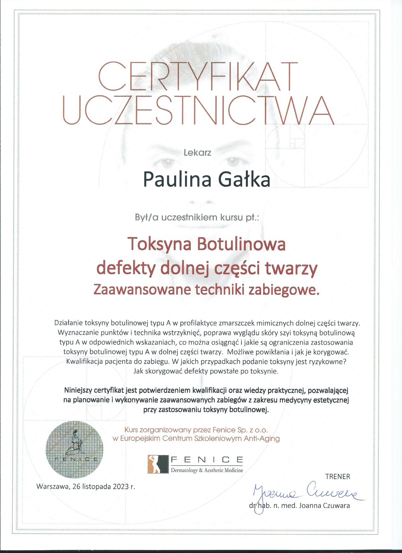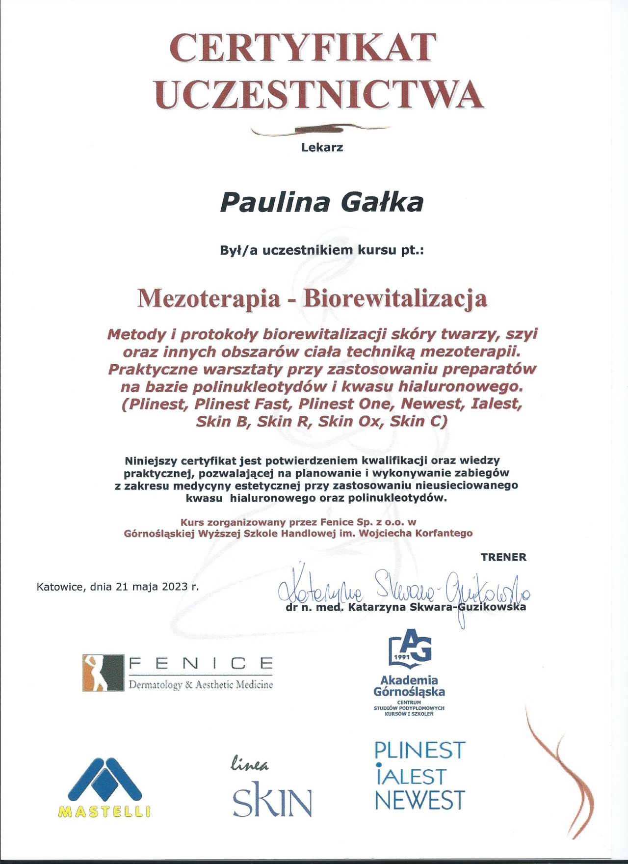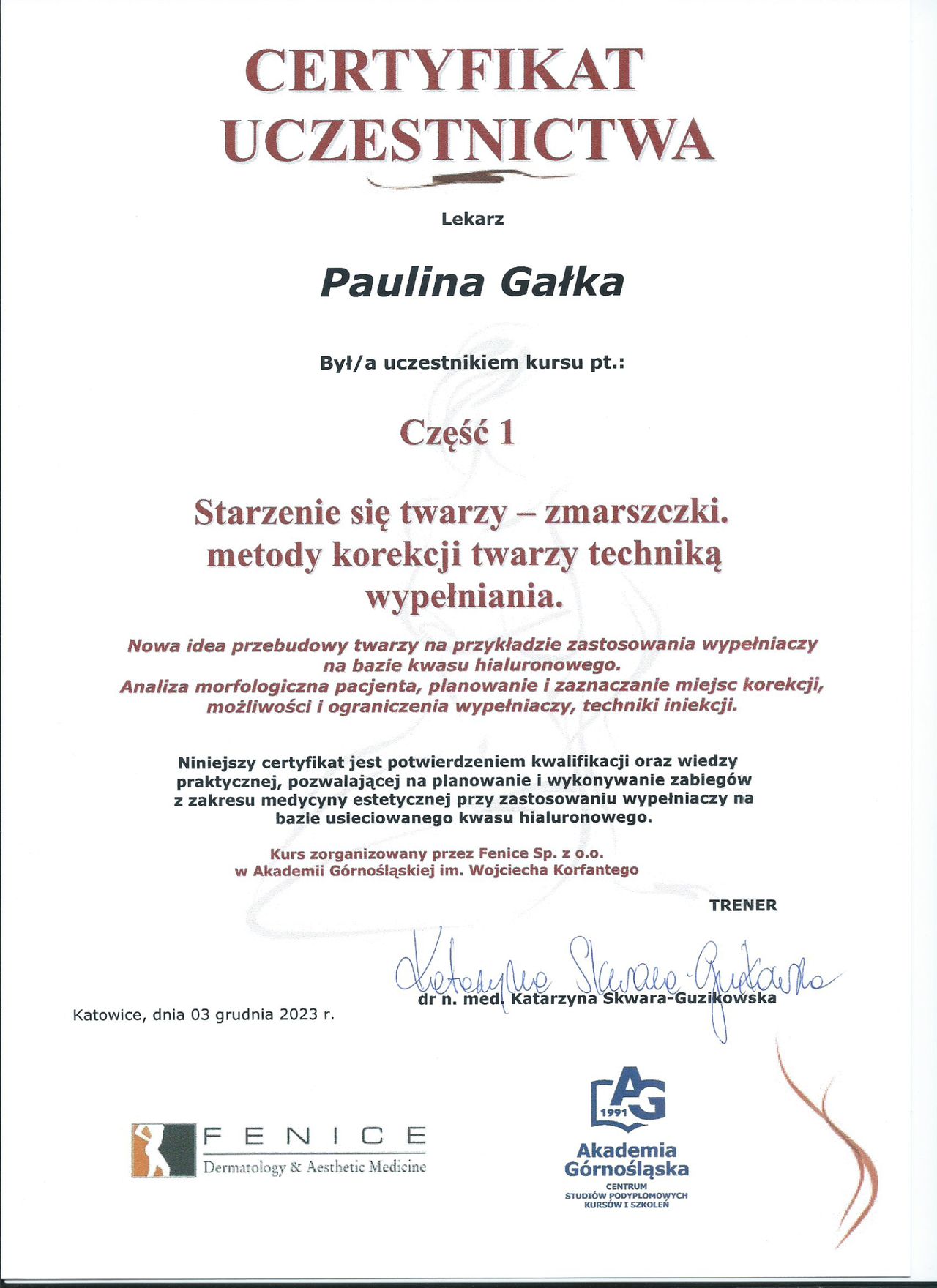 Jaki jest zakres porad oferowanych przez Paulina Gałka?Paulina Gałka to lekarz wykonujący zabiegi medycyny estetycznej. Na podstawie swojego doświadczenia i wykształcenia Paulina Gałka oferuje usługi takie jak: Konsultacja z zakresu medycyny estetycznej, mezoterapia igłowa, Mezoterapia igłowa twarz + szyja, Mezoterapia igłowa twarz + szyja + dekolt, Mezoterapia igłowa okolic oczu, RF FRAX Radiofrekfencja mikroigłowa twarzy, Toksyna botulinowa nadpotliwość pachy, Toksyna botulinowa 1 okolica, Toksyna botulinowa 2 okolice, Toksyna botulinowa 3 okolice.