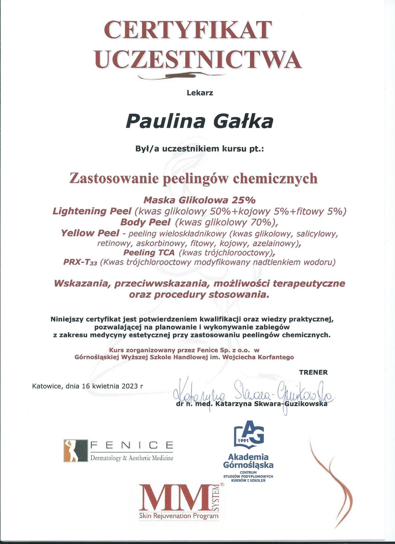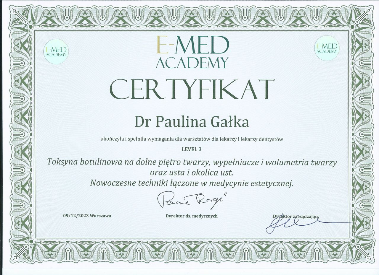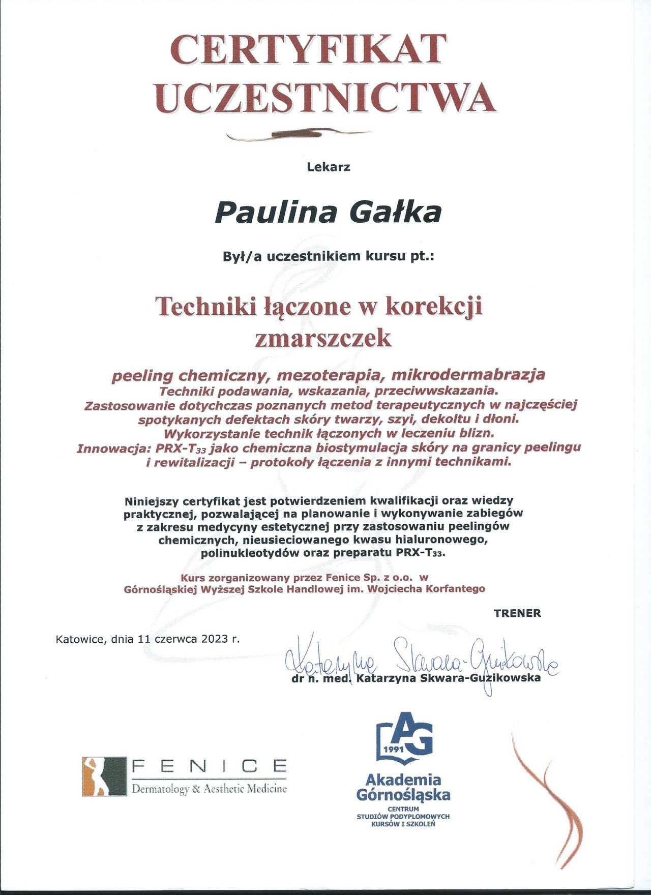 Jaki jest zakres porad oferowanych przez Paulina Gałka?Paulina Gałka to lekarz wykonujący zabiegi medycyny estetycznej. Na podstawie swojego doświadczenia i wykształcenia Paulina Gałka oferuje usługi takie jak: Konsultacja z zakresu medycyny estetycznej, mezoterapia igłowa, Mezoterapia igłowa twarz + szyja, Mezoterapia igłowa twarz + szyja + dekolt, Mezoterapia igłowa okolic oczu, RF FRAX Radiofrekfencja mikroigłowa twarzy, Toksyna botulinowa nadpotliwość pachy, Toksyna botulinowa 1 okolica, Toksyna botulinowa 2 okolice, Toksyna botulinowa 3 okolice.