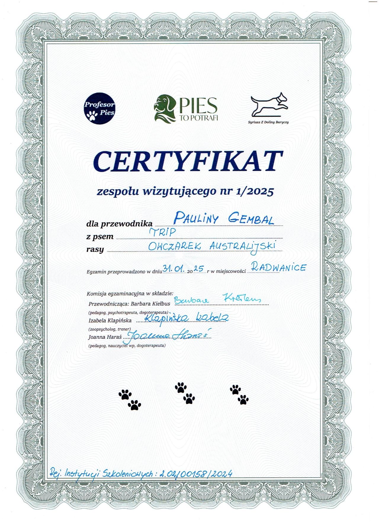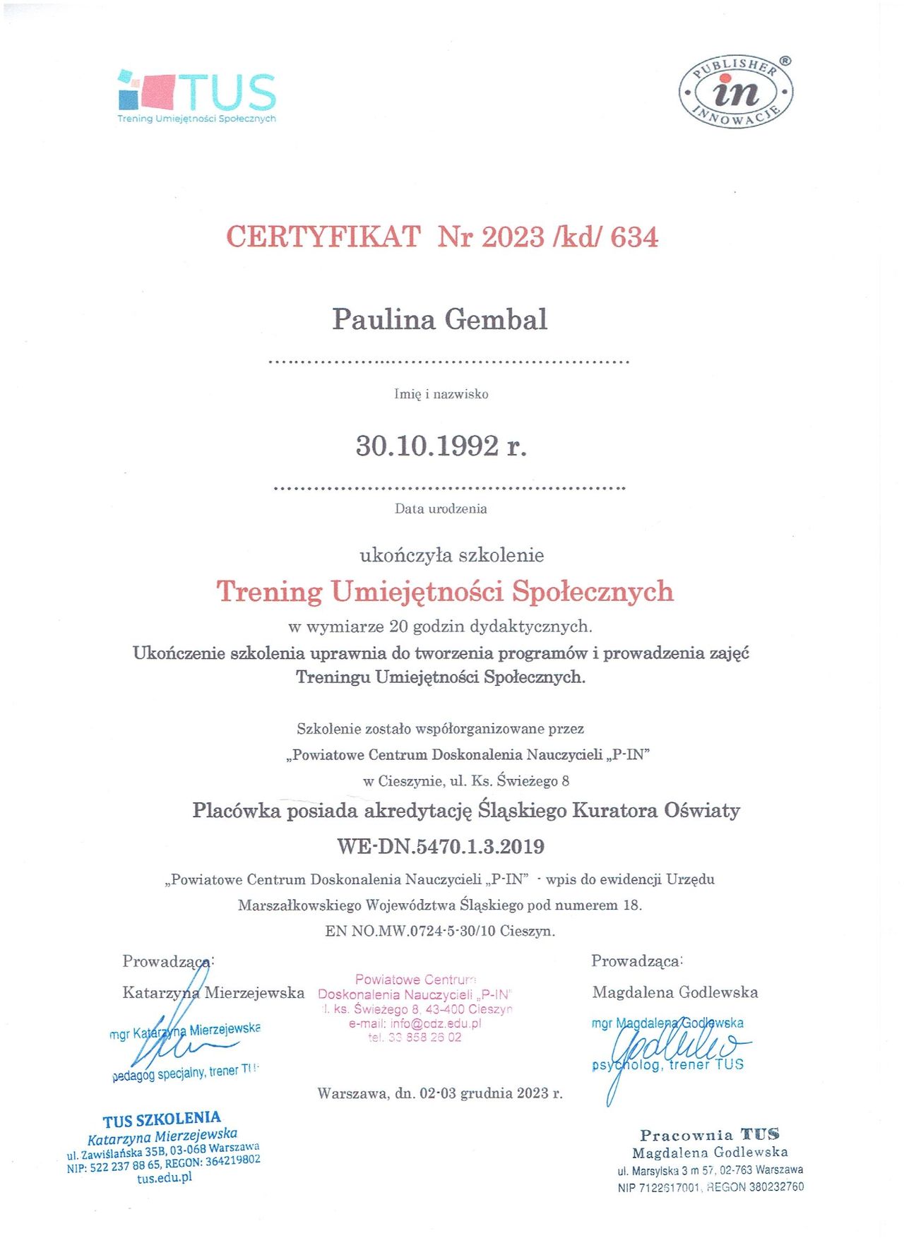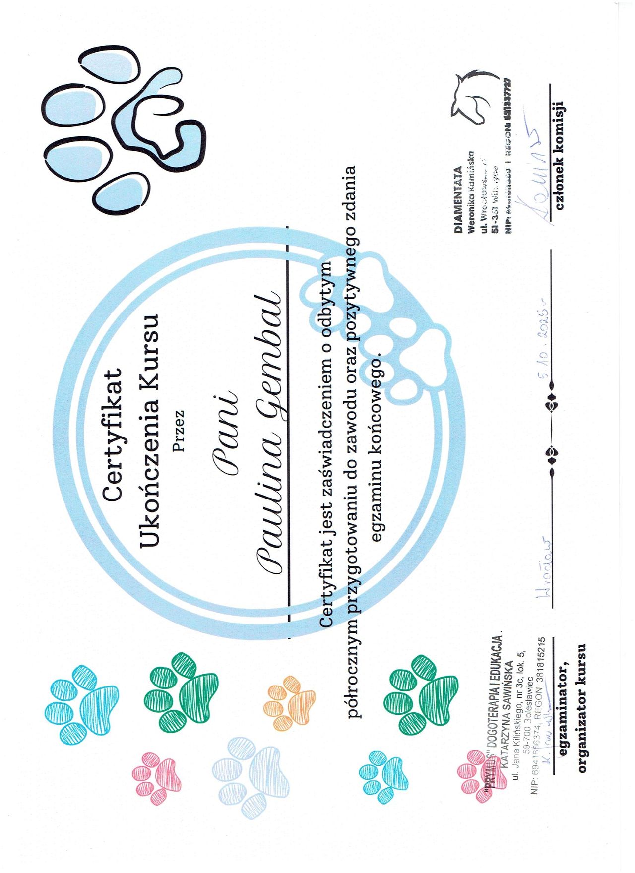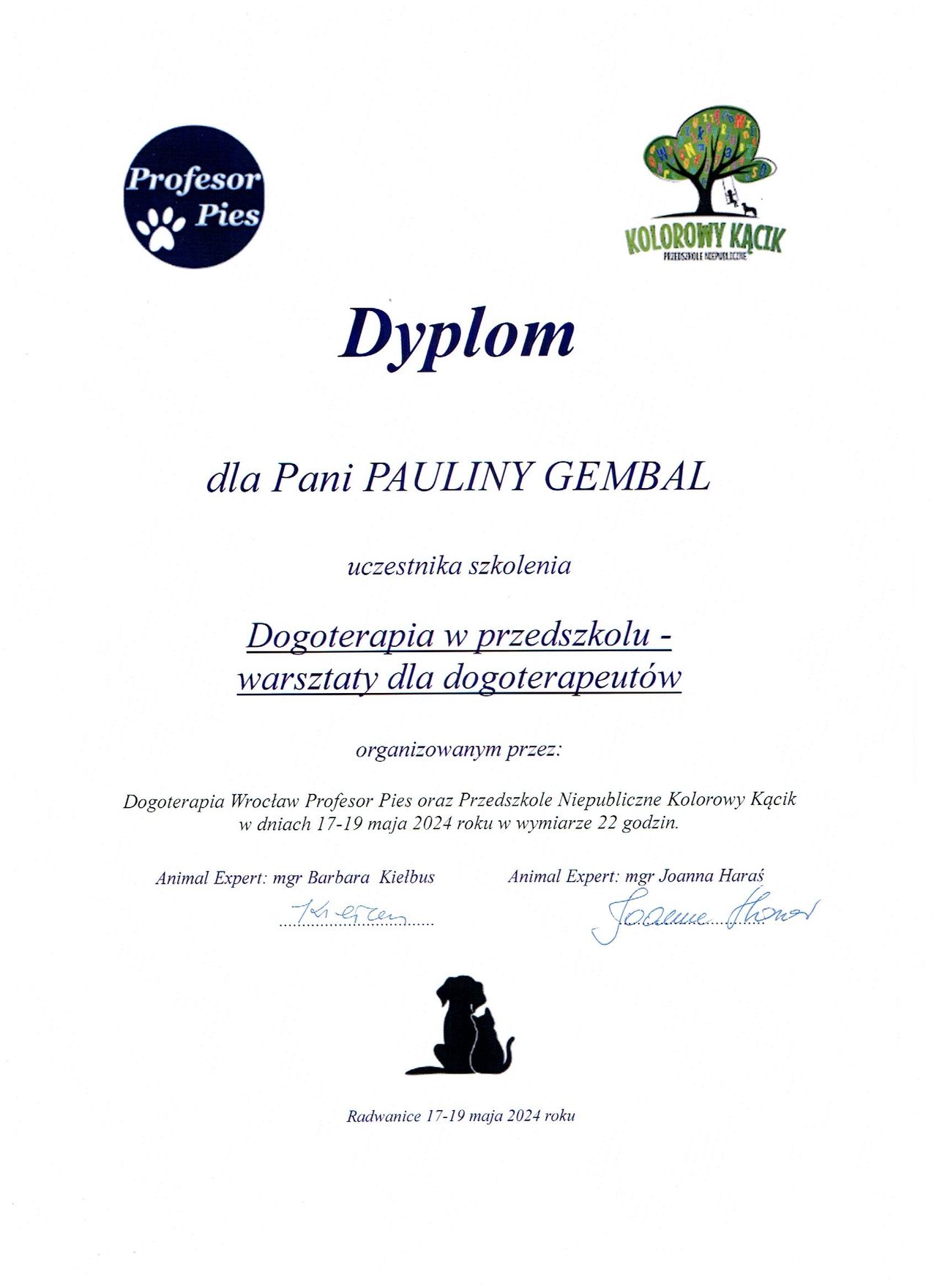 Ukończyłam kurs Trenera Umiejętności Społecznych (TUS) oraz liczne szkolenia z zakresu dogoterapii. Stale podnoszę swoje kwalifikacje, uczestnicząc w szkoleniach i kursach dotyczących pracy z dziećmi i młodzieżą.