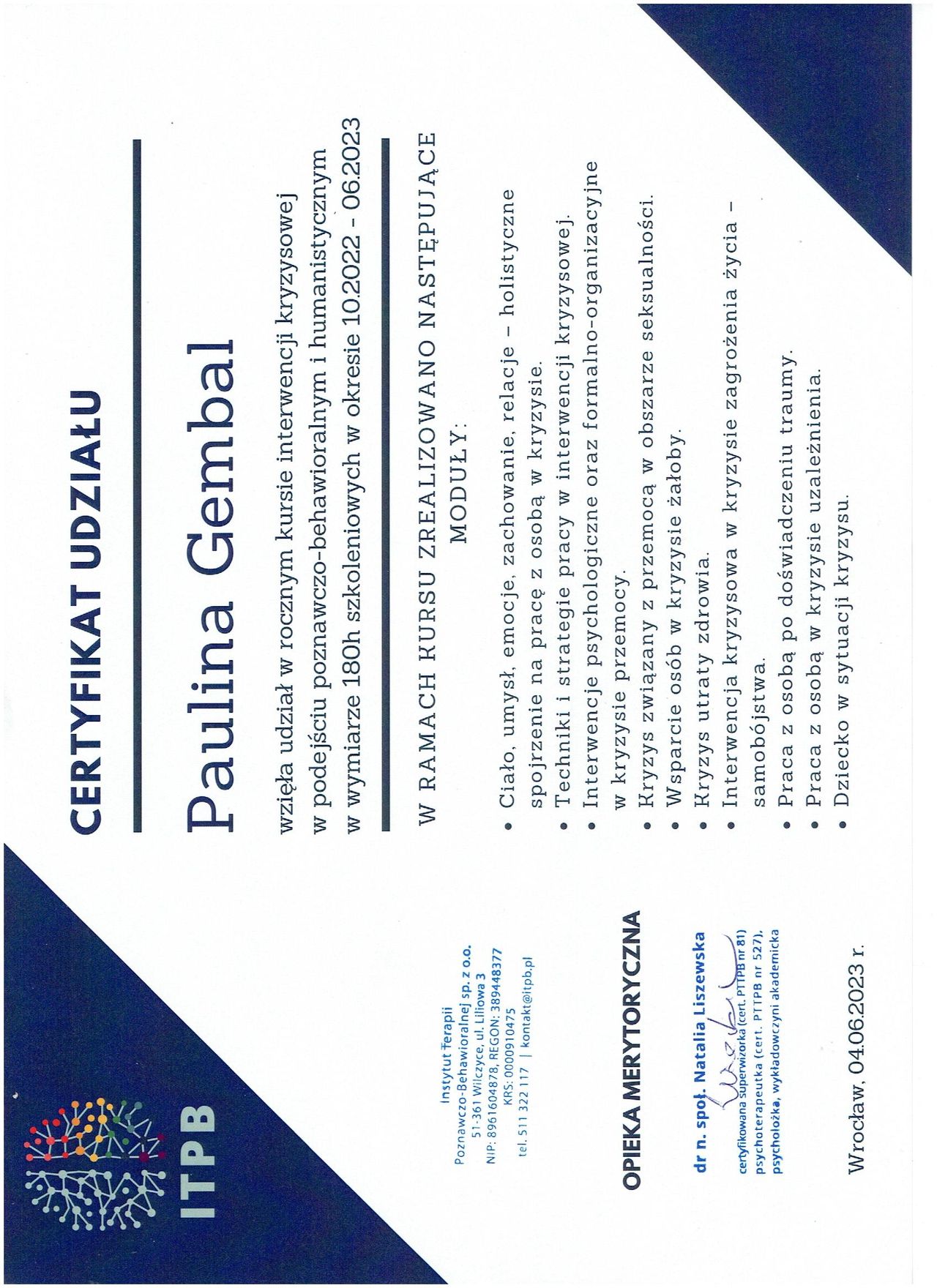 Jestem uczestnikiem całościowego kursu psychoterapii w nurcie integracyjnym, z przewagą podejścia systemowego i ericksonowskiego na Wrocławskim Instytucie Psychoterapii.