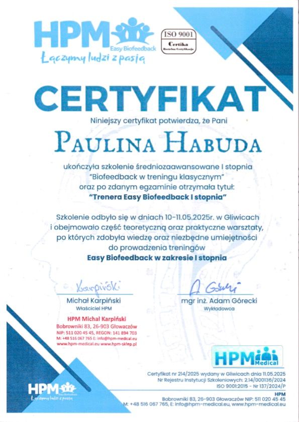 Pracuję również jako certyfikowana terapeutka EEG Biofeedback I stopnia. Zapraszam do mojego doskonale wyposażonego gabinetu w Krakowie na diagnozę oraz treningi EEG Biofeedback. EEG Biofeedback jest doskonałą metodą pomagającą w leczeniu zaburzeń koncentracji, wzmacniania zdolności poznawczych, wspomaga leczenie ADHD, depresji, bezsenności oraz ma bardzo dużo innych zastosowań - więcej szczegółów przekazuję tutaj