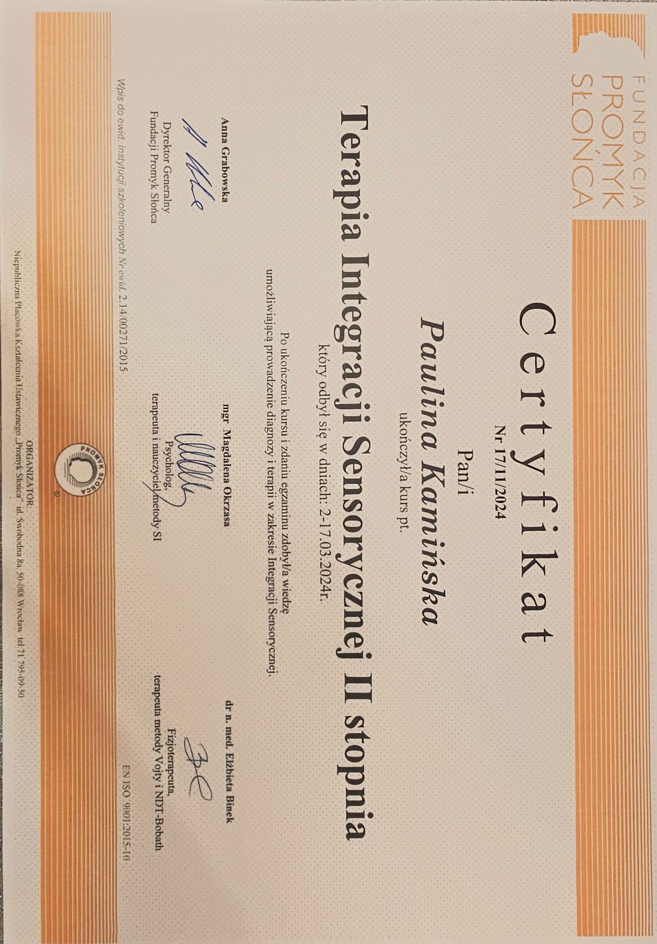 Jaki jest zakres porad oferowanych przez Paulina Iga Kamińska?Paulina Iga Kamińska to fizjoterapeuta. Na podstawie swojego doświadczenia i wykształcenia Paulina Iga Kamińska oferuje usługi takie jak: Drenaż limfatyczny, Diagnoza zaburzeń integracji sensorycznej z opinią, Kompresjoterapia – bandażowanie kończyny dolnej, kompleksowa terapia obrzęków, Fizjoterapia dzieci (pierwsza wizyta), Fizjoterapia dzieci (kolejna wizyta), Diagnostyka fizjoterapeutyczna, konsultacja limfologiczna (obrzękowa), Fizjoterapia (kolejna wizyta), drenaż limfatyczny 60 minut.