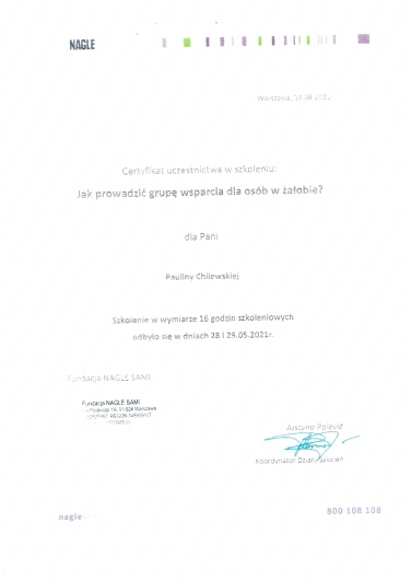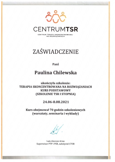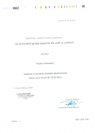W swojej pracy psychoterapeutycznej kieruję się zasadą towarzyszenia i wspierania w drodze do zmiany. Pomagam w wyznaczeniu celu, określenia trudności oraz znalezieniu najlepszego rozwiązania wydobywając zasoby, które posiada klient. Jeśli: • przeżywasz żałobę, stratę; • zmagasz się z chorobą swoją lub bliskiej osoby; • poczułeś zwątpienie, brak sensu; • mierzysz się z niską samooceną, brakiem pewności siebie; • napotykasz trudności w nawiązywaniu nowych relacji; • w bliskich relacjach przeżywasz trudności; • nie jesteś zadowolony ze swojego życia osobistego/zawodowego; • masz trudności w podejmowaniu decyzji; Zapraszam do rozmowy, od której wszystko się zaczyna! Zapraszam do kontaktu. Doświadczenie zawodowe zdobywałam w Centrum Interwencji Kryzysowej w Gdańsku, gdzie poszerzałam swoją wiedzę z pomocy psychologicznej w szeroko rozumianej interwencji kryzysowej. W Kaszubskiej Fundacji Osób Niepełnosprawnych „Podaruj Trochę Słońca” doskonaliłam się z zakresu wsparcia rozwoju dzieci i młodzieży, a także wspomagałam rodziców, Obecnie współpracuję z Hospicjum Pomorze Dzieciom udzielając wsparcia psychologicznego rodziną podopiecznych hospicjum oraz Emocja Holistyczne Centrum Wsparcia po Stracie, w którym udzielam krótkoterminowego wsparcia osobą doświadczającym żałoby lub zmagającym się z ciężką nieuleczalną chorobą. Swoje kompetencje podnoszę uczestnicząc w szkoleniach, konferencjach, webinarach i warsztatach, a swoją pracę poddaję superwizji. Obecnie pracuję tylko online. Jak odwołać/przełożyć wizytę: Wizytę można odwołać do 24 godzin przed umówioną godziną jej rozpoczęcia. W tym celu proszę zalogować się na swoje konto na portalu Znany Lekarz i dokonać samodzielnie zmiany. Bardzo dziękuję i serdecznie zapraszam do umówienia wizyty.