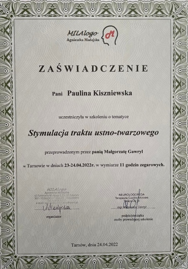 Najbardziej zależy mi na tym, aby szczególnie Mały Pacjent czuł się komfortowo w gabinecie, dlatego wszystkie ćwiczenia prowadzone są w formie zabawy, w przyjaznej dla Rodzica i Malucha atmosferze.