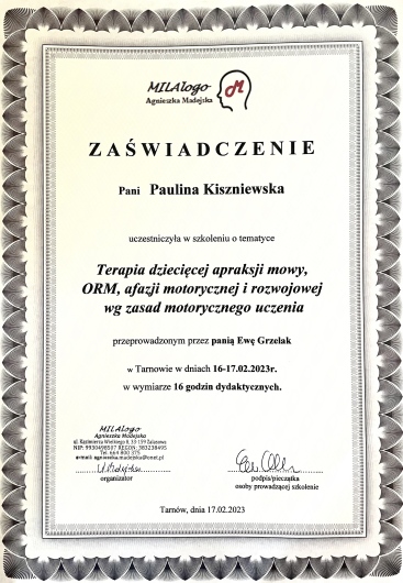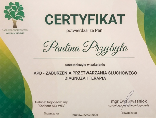 Jestem neurologopedą z 10-letnim doświadczeniem w pracy z dziećmi. Aby jak najlepiej pomagać wszystkim Pacjentom, cały czas poszerzam swój warsztat pracy i wiedzę uczestnicząc w licznych szkoleniach i kursach.