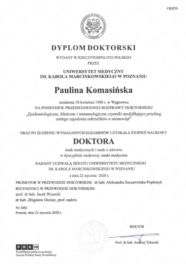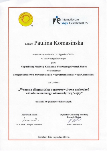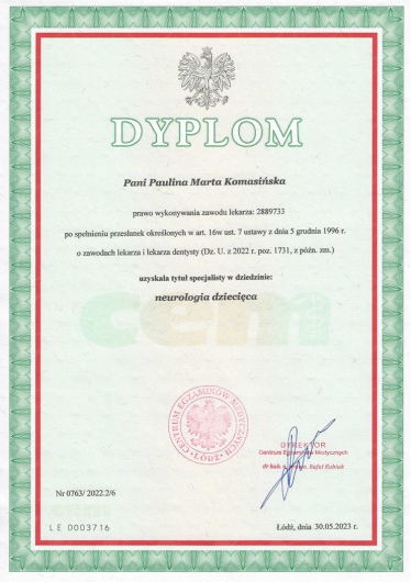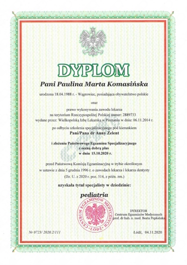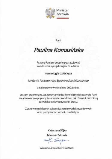 dr n. med. Paulina Komasińska-Piotrowska to neurolog dziecięcy przyjmujący w Plewiskach. Lekarz specjalista, który zbada Państwa dzieci pod kątem zaburzeń działania układu nerwowego. Do jej specjalizacji należy m.in. badanie prawidłowości napięć u niemowlaków, ocena przyczyny zaburzeń koncentracji i zapamiętywania u dzieci szkolnych a także diagnostyka przyczyny bólów głowy u nastolatków.
