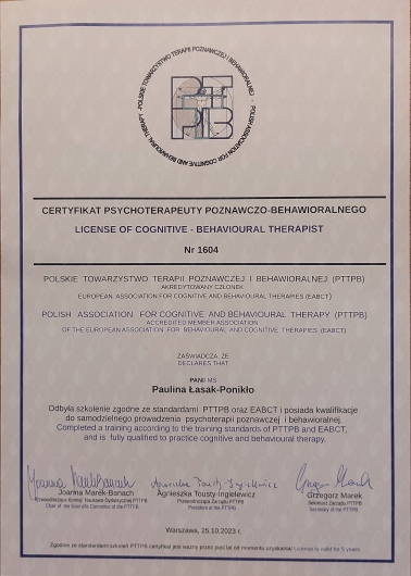 Skończyłam psychologię stosowaną na Uniwersytetu Jagiellońskiego i seksuologię kliniczną w SWPS. Zaliczam się do członków Polskiego Towarzystwa Terapii Poznawczej i Behawioralnej, jestem certyfikowanym psychoterapeutą poznawczo-behawioralnym (nr cert. 1604). Pracuję wykorzystując tradycyjne podejście cbt, jak i podejścia trzeciej fali, przede wszystkim terapię schematów. Swoją pracę poddaję regularnej superwizji.