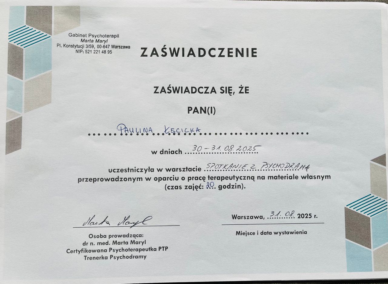 Bardzo polecam spotkania z p. Pauliną. Niesamowicie zaangażowana, empatyczna i przyjazna Pani psycholog. Jestem w terapii od kilku miesięcy i śmiało mogę powiedzieć z perspektywy czasu, że moje życie się zmienia. Dostaje na spotkaniach dużo cennych wskazówek. Bardzo sobie cenie również wspólną analizę moich zachowań i schematów, to pozwala mi głębiej zrozumieć siebie.