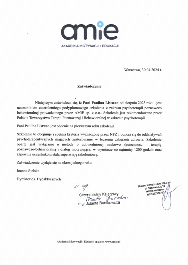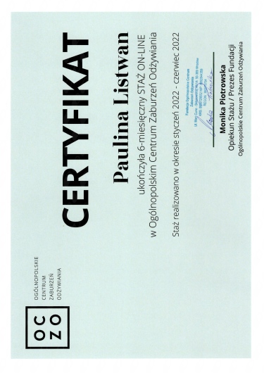 Cały czas się uczę i poszerzam wiedzę poprzez czytanie książek i uczestnictwo w szkoleniach. W ostatnim czasie przeszłam dłuższe szkolenie z zakresu wsparcia osób mających zaburzenia odżywiania i z zakresu uzależnień behawioralnych.