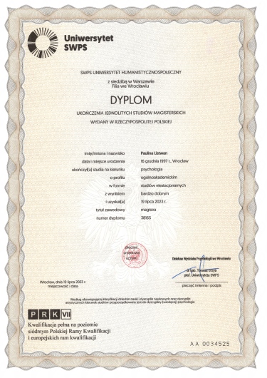 Pani Paulina bardzo fachowo zajęła się moją córką, która przeżywała trudniejszy okres i jej pewnośc siebie została mocno zachwiana. Pani Paulina miała świetne podejście do młodego czlowieka, pełne szacunku i emaptii, równocześnie zadbała o to aby zaangazowac równiez mnie w procesie terapii. Bardzo podobało mi się określenie ram czasowych juz na poczatku wizyt. Wiem, że jeśli córka będzie potrzebowała pomocy to z pewnością zwrócę się znów do Pani Pauliny