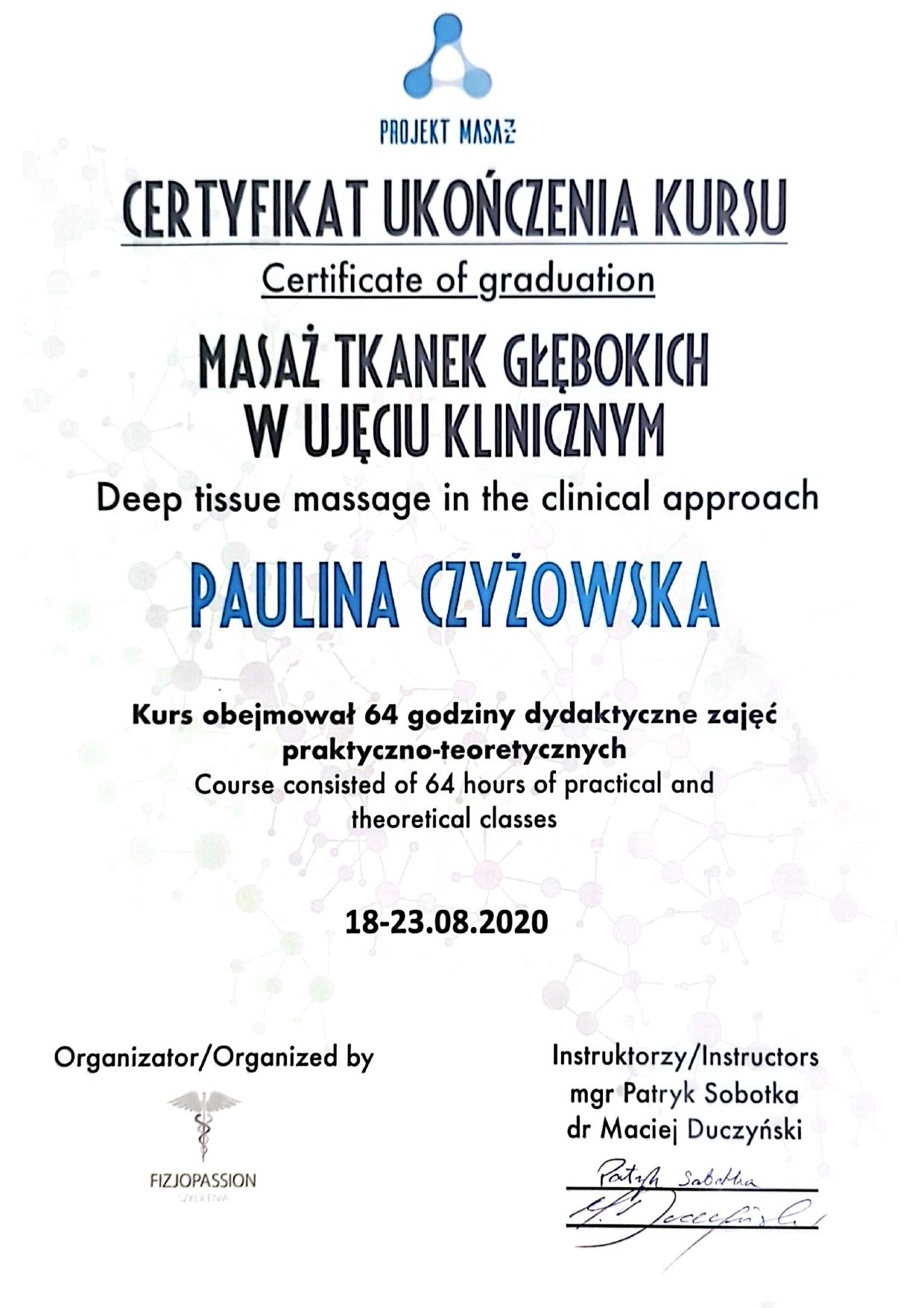 Nazywam się Paulina Niewińska - osteopatka z pasją! Magister fizjoterapii Akademii Wychowania Fizycznego we Wrocławiu i studentka czwartego roku osteopatii w Still Academy of Osteopathy. Mam holistyczne podejście do terapii, skupiając się na odnajdywaniu przyczyn bólu, a nie tylko łagodzeniu objawów.