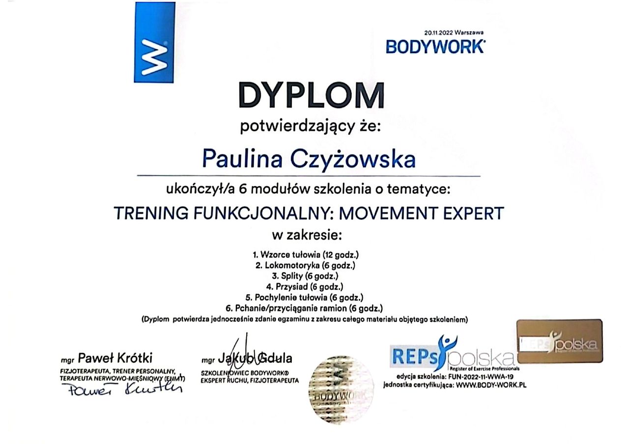 Nie zapominam również o ruchu. Od 2022 roku jestem trenerem funkcjonalnym, gdzie zarówno w pracy z pacjentami ortopedycznymi, jak i neurologicznymi zwracam uwagę na funkcjonalność ciała. Edukuję swoich pacjentów, jak wspierać ciało, aby radziło sobie z obciążeniem życia codziennego.