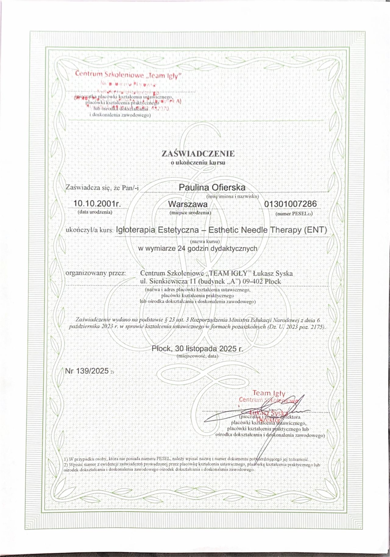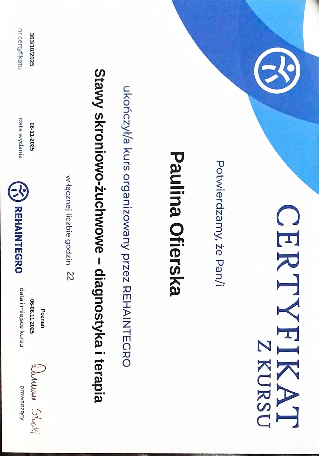 Swoją przygodę zawodową rozpoczęłam od kursu tapingu, a następnie rozwijałam swoje umiejętności w zakresie masażu kobido, masażu transbukalnego, komplementarnej terapii zatok oraz dysfunkcji stawów skroniowo-żuchwowych, w tym kursu CRAFTA. Zainteresowałam się także igłoterapią estetyczną, co pozwoliło mi poszerzyć ofertę o nowoczesne i skuteczne metody poprawy wyglądu oraz funkcji tkanek.