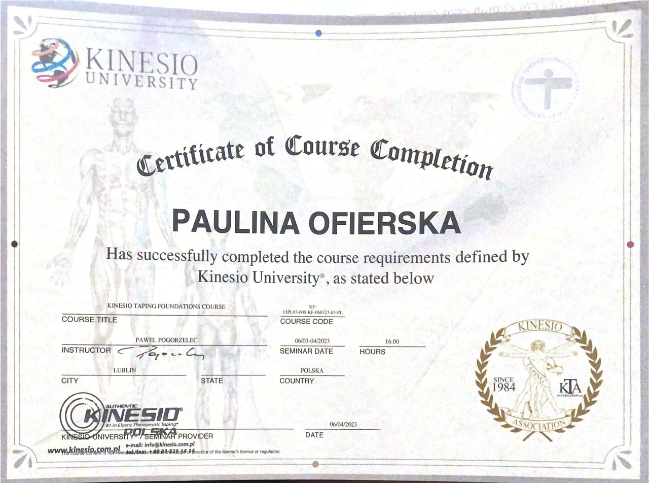 Jaki jest zakres porad oferowanych przez Paulina Ofierska?Paulina Ofierska to fizjoterapeuta. Na podstawie swojego doświadczenia i wykształcenia Paulina Ofierska oferuje usługi takie jak: konsultacja fizjoterapeutyczna, Mobilizacja blizny, Terapia zatok, Terapia blizny, masaż Kobido, Masaż kobido + taping, kinesiotaping, fizjoterapia estetyczna, Trening EMS, fizjoterapia stomatologiczna.