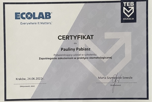 Jestem bardzo zadowolona z zabiegu higienizacji u Pani Pauliny. Nie odczuwałam żadnego dyskomfortu, przeprowadziła go w sposób niezwykle delikatny, co dla mnie ważne, bo mam sporą nadwrażliwość. Efekt był niesamowity, bo każdy nawet najmniejszy osad został usunięty, przy wcześniejszych higienizacjach w innych gabinetach nie zawsze efekt był tak dobry. Czułam się przez 45 min zabiegu jak na drzemce, a nie w gabinecie stomatologicznym.