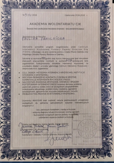 Zajmuję się wsparciem osób znajdujących się w kryzysie. Pracuję z osobami chorującymi psychicznie. Psychoedukuję i wspieram osoby doświadczające przemocy. Pracuję z osobami dorosłymi.