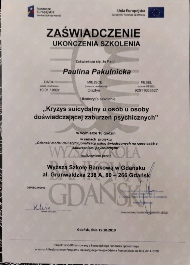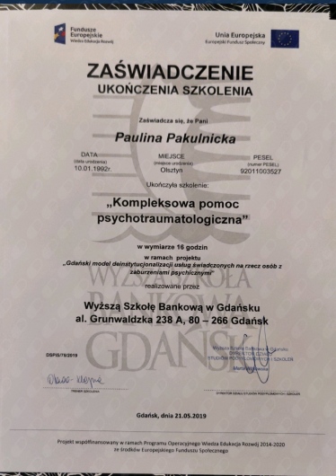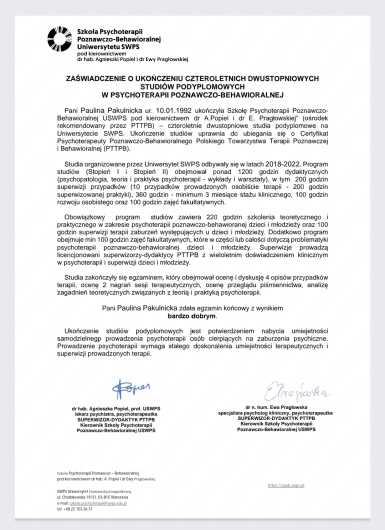 Pani Paulina jest świetną, profesjonalną psychoterapeutką i bardzo sympatyczną osobą. Podczas kilku miesięcy terapii, nigdy nie poczułam się oceniona, mimo że czasami sama na głos śmiałam się z tego, o jakich błahostkach mówię. Pani Paulina do wszystkiego podchodziła poważnie i z odpowiednim zrozumieniem, czułam się wysłuchana. Wszystko cierpliwie wyjaśniała, tłumaczyła, podając za każdym razem idealnie obrazujące przykłady i analogie. Bez nadętej, sztucznej atmosfery, bez przesady w żadną stronę. Pani Paulina potrafi stworzyć naprawdę komfortową przestrzeń, zażartować, a przy tym ma ogromną wiedzę i potrafi ją w odpowiedni dla danej osoby sposób przekazać - tak, by można było nad sobą (i ze sobą) pracować. Terapia bardzo mi pomogła, uświadomiła wiele rzeczy i dała odpowiednie narzędzia, by radzić sobie lepiej.