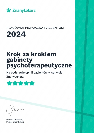 Trafiłam do dr Pauliny Płóciennik z polecenia i nie żałuję. Lekarz z ogromnym sercem do pacjenta — słucha, tłumaczy i naprawdę stara się pomóc. Wizyta odbyła się bez pośpiechu, a ja czułam się zaopiekowana i zrozumiana. Bardzo dziękuję i gorąco polecam!• Krok za krokiem gabinety psychoterapeutyczne • terapia psychologiczna dla dzieci i młodzieży •