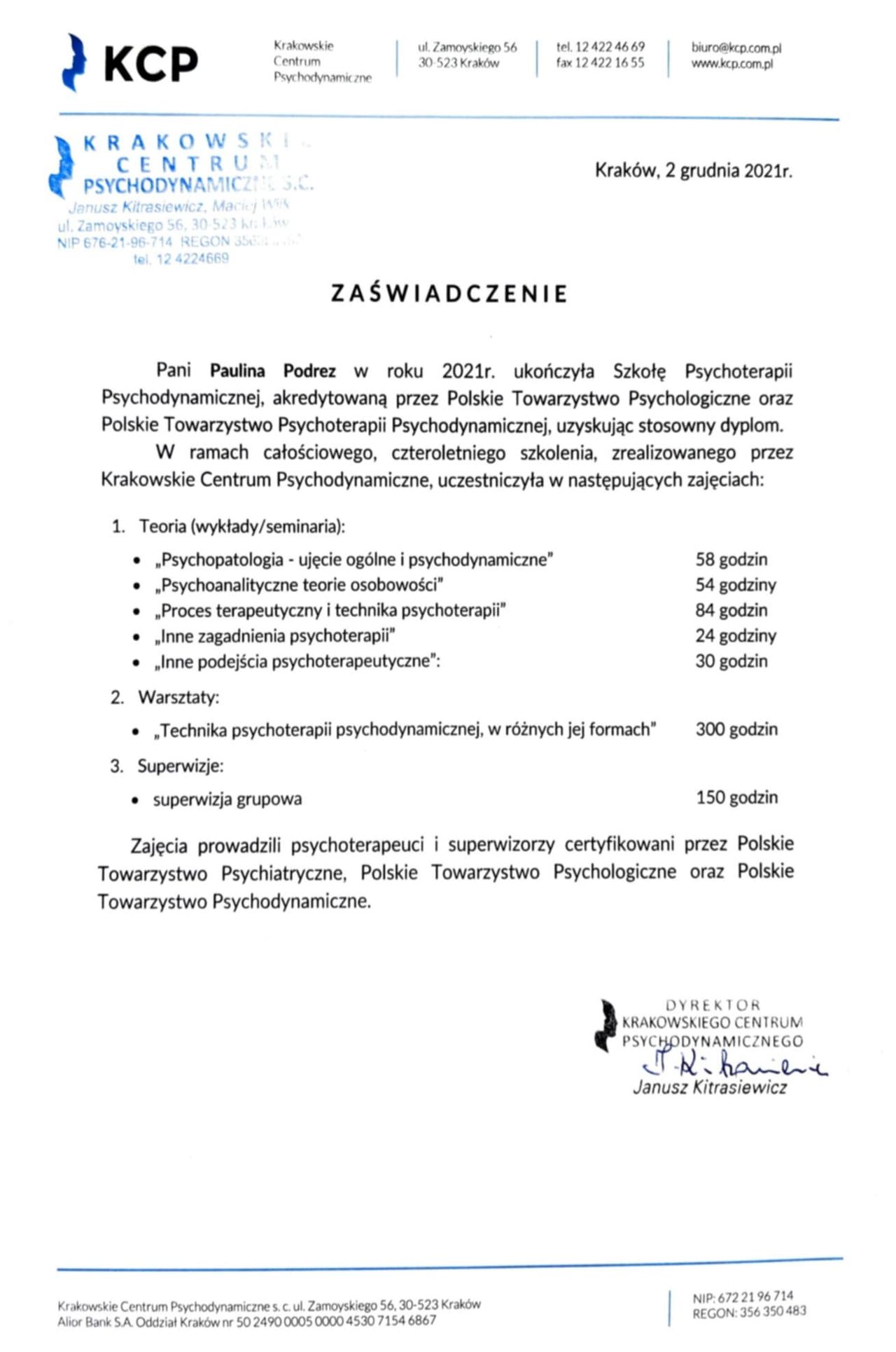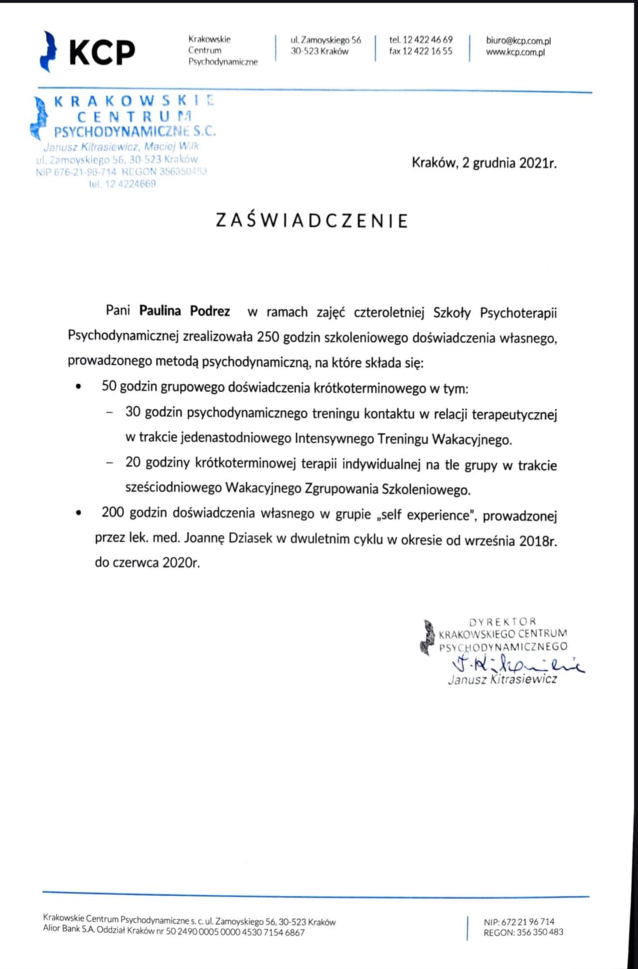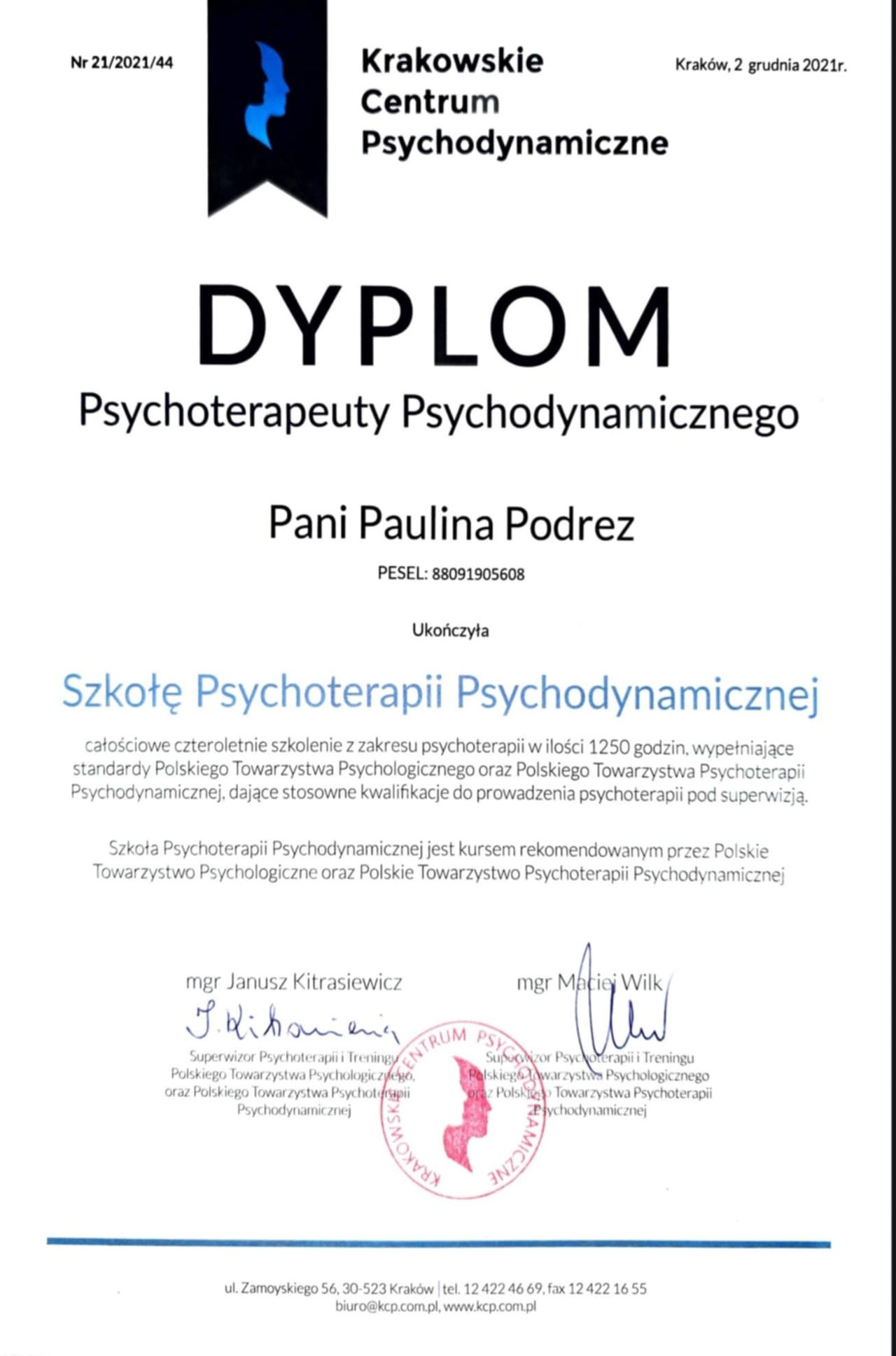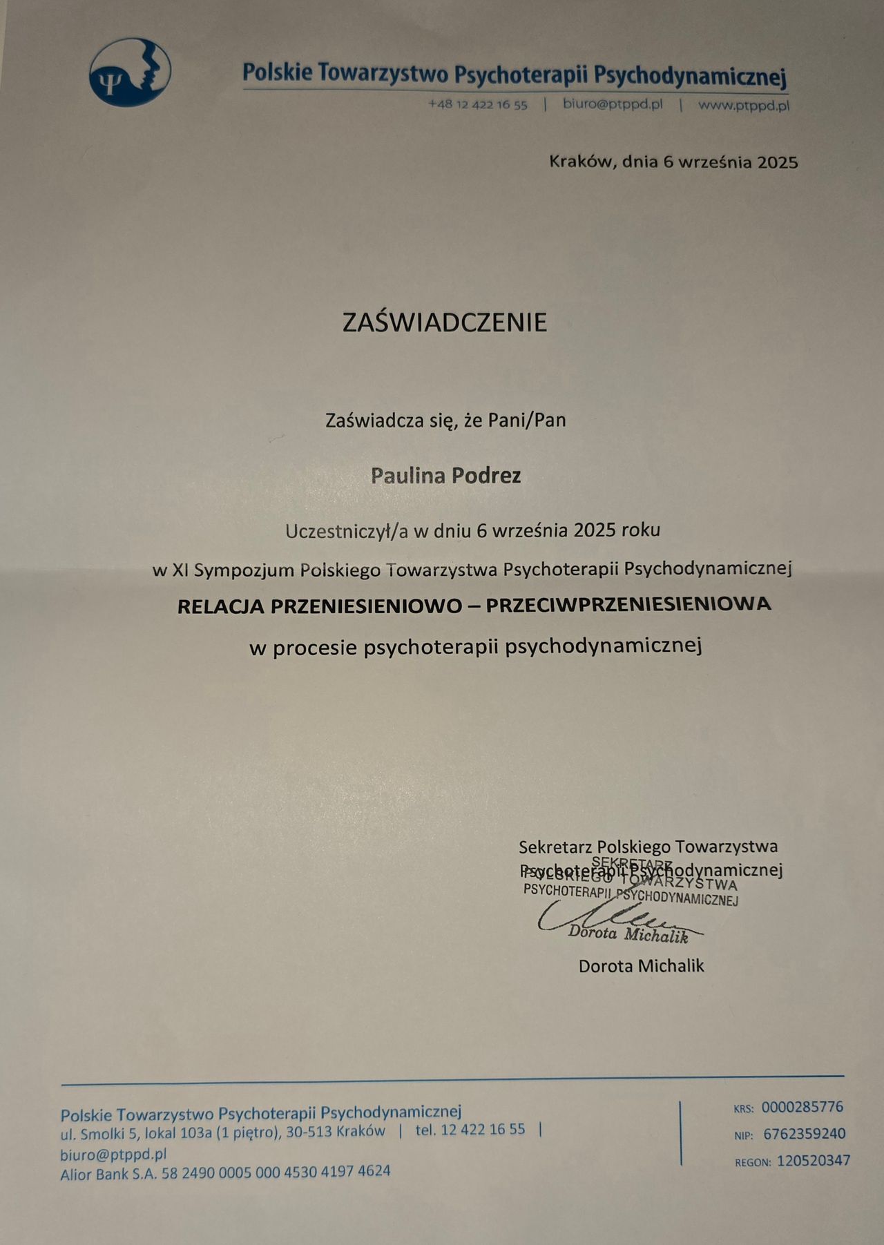 mgr Paulina Natalia Podrez - psycholog, psychoterapeuta, seksuolog, założycielka PRZESTRZEŃ HOLISTIC Twoje Miejsce Terapii i Rozwoju. Członek PTS, PTPPd.