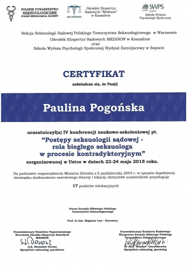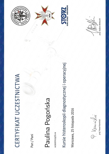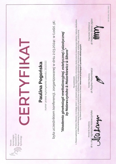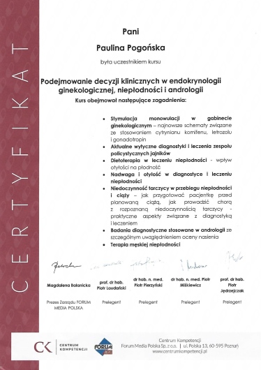 Ukończyłam Gdański Uniwersytet Medyczny (2004 - 2010). Jestem lekarzem ze specjalizacją z położnictwa i ginekologii, jak również seksuologiem klinicznym, aktualnie jestem w trakcie specjalizacji z endokrynologii. Staram się stale podnosić swoje kwalifikacje uczestnicząc w licznych kursach, konferencjach oraz sympozjach naukowych krajowych, jak i zagranicznych. Jestem członkiem towarzystw naukowych (PTG, PTMRiE, PTA, ESHRE).
