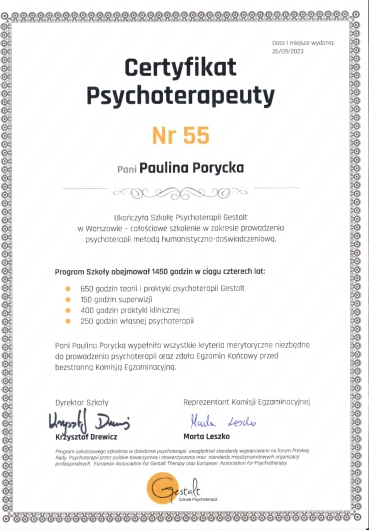 Jaki jest zakres porad oferowanych przez Paulina Porycka?Paulina Porycka to psychoterapeuta certyfikowany. Na podstawie swojego doświadczenia i wykształcenia Paulina Porycka oferuje usługi takie jak: psychoterapia indywidualna, psychoterapia okołoporodowa, psychoterapia w języku angielskim, konsultacja psychoterapeutyczna, psychoterapia par i małżeństw.