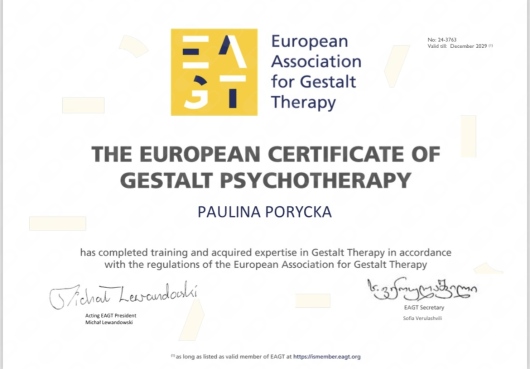 Jestem certyfikowaną psychoterapeutką gestalt. Praca psychoterapeutyczna w tym podejściu polega na poszerzaniu pola świadomości Klients, dzięki czemu otwierają się przed nią/nim nowe wybory postępowania i odbioru siebie, innych i świata. Bycie psychoterapeutką gestalt oznacza dla mnie osadzenie w „tu i teraz”, pracę w oparciu o relację terapeutyczną, stwarzanie przestrzeni na dialog, pracę z ciałem i doświadczenia. Ukończyłam czteroletnie całościowe studia psychoterapii gestalt w Szkole Psychoterapii Gestalt w Warszawie i uzyskałam certyfikat wydawany przez międzynarodową organizację EAGT (European Association of Gestalt Therapy), a moją pracę poddaję stałej superwizji u certyfikowanych superwizorów. Uczestniczę w kursach i treningach dodatkowych prowadzonych przez ekspertów z Polski i zagranicy. Pozwalają mi się one stale rozwijać i jeszcze lepiej rozumieć potrzeby osób zgłaszających się po pomoc. Mam wieloletnie doświadczenie w pracy z ludźmi i 6 lat doświadczenia w prowadzeniu indywidualnej praktyki psychoterapeutycznej. Każda osoba zgłaszająca się do mnie jest dla mnie jedyna w swoim rodzaju. Traktuję ją z szacunkiem, ciekawością, empatią i poufnością. Zapraszam Cię jeśli doświadczasz: -trudności w relacji z bliskimi, otoczeniem, sobą samym -stresu i trudności życiowych, z którymi jest Ci ciężko sobie radzić -zaburzeń adaptacyjnych -zaburzeń nastroju, depresji -poczucia braku sensu, smutku -niskiego poczucia wartości, braku wiary w siebie -straty bliskiej osoby -różnego rodzaju lęku, niepokoju którego źródło jest dla Ciebie trudne do zidentyfikowania. W pracy terapeutycznej kieruję się standardami zawartymi w Kodeksie Etycznym Polskiego Towarzystwa Psychoterapii Gestalt i EAGT. Oferta -Konsultacje psychoterapeutyczne Pierwsze 2-3 spotkania to spotkania konsultacyjne. Służą one poznaniu się terapeuty i klienta, zidentyfikowaniu rodzaju kłopotów jakich klient doświadcza, określeniu planu działania i kontraktu psychoterapeutycznego. Konsultacje psychoterapeutyczne mogą być same w sobie tym, czego klient potrzebuje i na tym poprzestaje, lub są otwarciem procesu psychoterapeutycznego. Czas trwania konsultacji:50 minut. koszt: 230 zł -Psychoterapia indywidualna gestalt Po konsultacjach, jeśli klient i psychoterapeuta tak ustalą, rozpoczyna się psychoterapia. Są to spotkania zwykle 1 raz w tygodniu i ich charakter jest dostosowany do potrzeb klienta. Czas psychoterapii jest zależny od trudności, jakich doświadcza klient i od jego potrzeb. Czas trwania sesji psychoterapeutycznej: 50 minut koszt: 230 zł -Psychoterapia par / małżeństw Zapraszam na psychoterapię pary / małżeństwa doświadczające kryzysu relacji. W psychoterapii pary klientem jest relacja, a praca terapeutyczna skupia się na poprawieniu komunikacji między partnerami. Sesja psychoterapeutyczna pary trwa 90 minut. koszt: 400 zł Swoją pomoc oferuję osobom dorosłym. Psychoterapię prowadzę w języku polskim, angielskim i francuskim. Koszt sesji to 300 zł. Zapraszam do umówienia wizyty przez kalendarz lub pod wskazanym numerem telefonu.