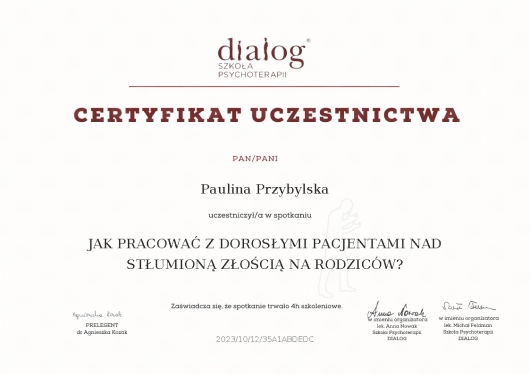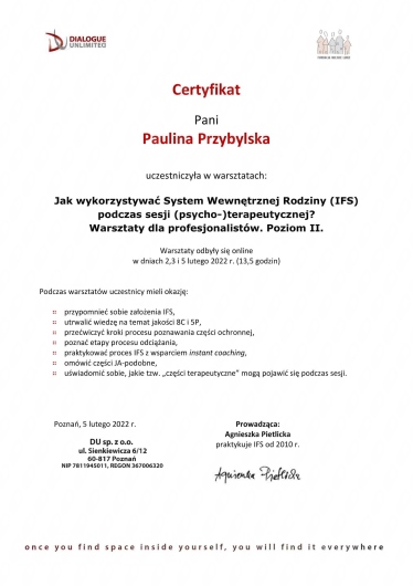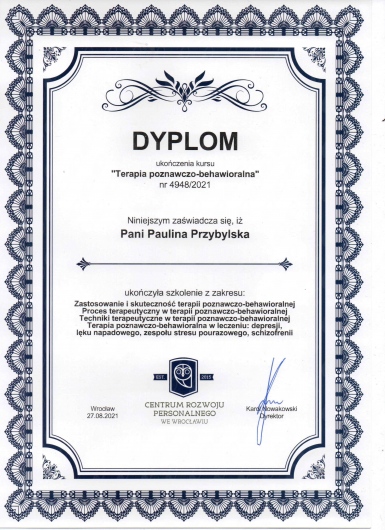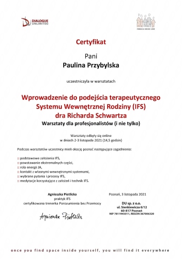 Właśnie minął rok z Panią Pauliną. Trafiłam z polecenia i już po pierwszej wizycie wiedziałam, że to będzie to. Terapia przyniosła wiele zmian w moim życiu, poprawiła relacje w rodzinie i z partnerem. Polecam współpracę z Panią Pauliną, jest specjalistą w swoim fachu, zadającym właściwe pytania, we właściwym momencie.