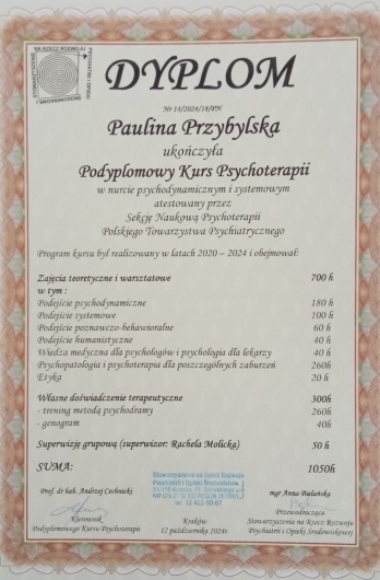 P.Paulina pomogła mi przejść przez najtrudniejszy okres w moim życiu.Dzięki niej udało się uratować marzenia,o które zabiegałam od dawna lecz z powodu lęku i ograniczających przekonań wydawało się to niemożliwe.Każda rozmowa dawała nadzieję,ale i rzeczywistą poprawę stanu.Bez P. Pauliny niewątpliwie nie byłabym w tym miejscu,w którym jestem dzisiaj.Udało mi się otworzyć na zdrową relację partnerską.Jest niezwykle kompetentna i profesjonalna,posiada ogromną wiedzę.Ciągle poszukiwała nowych narzędzi,polecała książki,filmy,techniki relaksacyjne,własnoręcznie tworzyła afirmacje,do których zaglądam do dziś.Jej empatia wychodzi poza samo słuchanie,potrafi wczuć się w sytuację i uczucia pacjenta,co tworzy atmosferę zaufania i bezpieczeństwa.Niezależnie od tematu,zawsze potrafi znaleźć odpowiednie słowa i wyrazić wsparcie.Ma niesamowitą pamięć, pamięta ważne szczegóły,dostrzega progres.1,5roku wspólnej pracy to najlepsza inwestycja w siebie,która mam nadzieję będzie owocować przez długie lata.