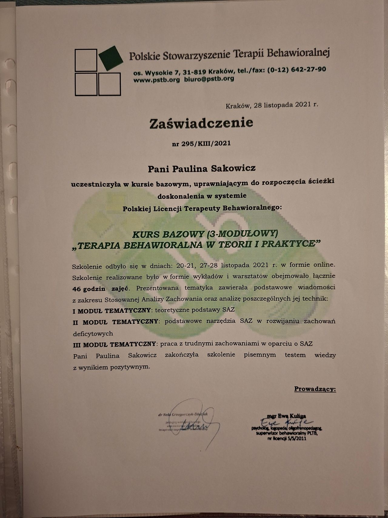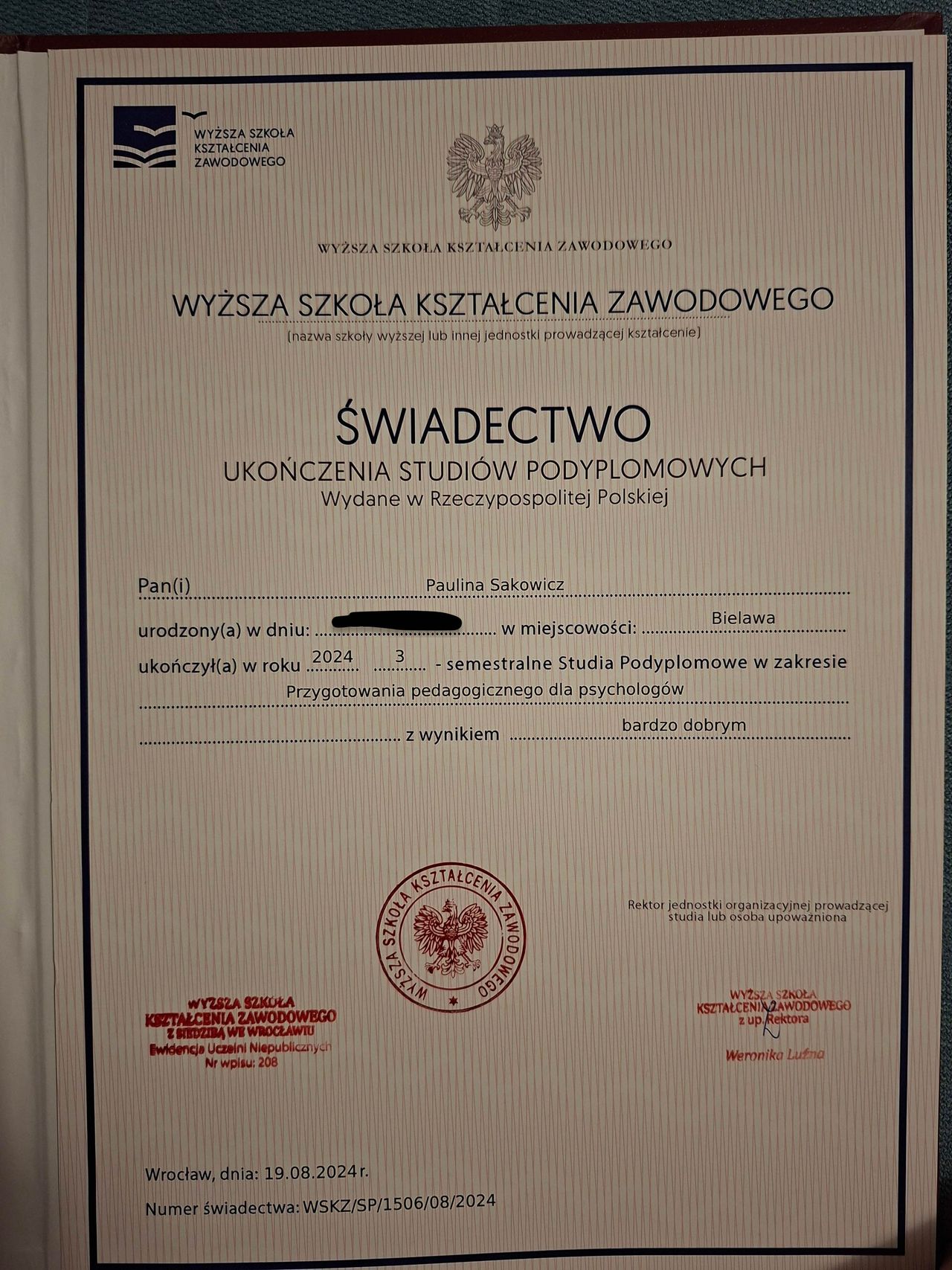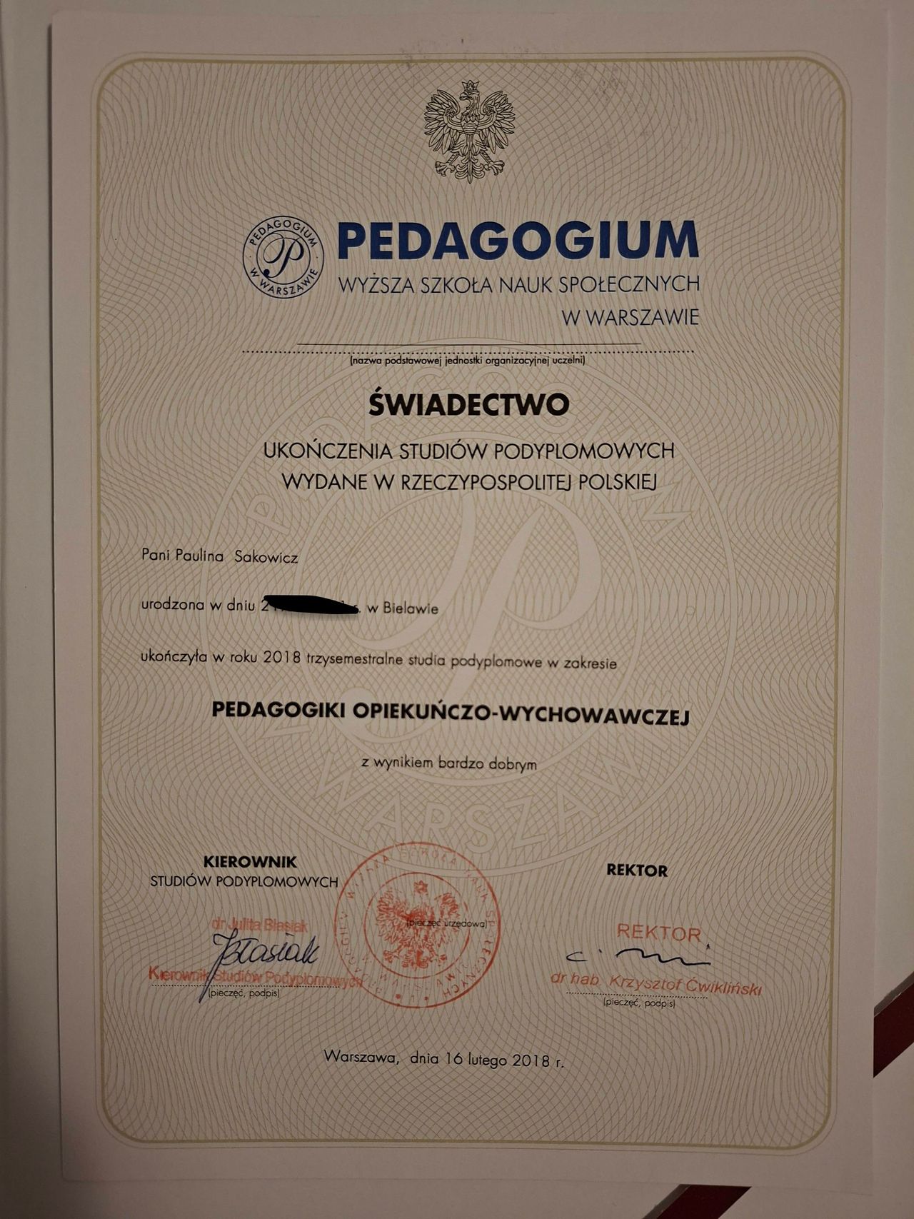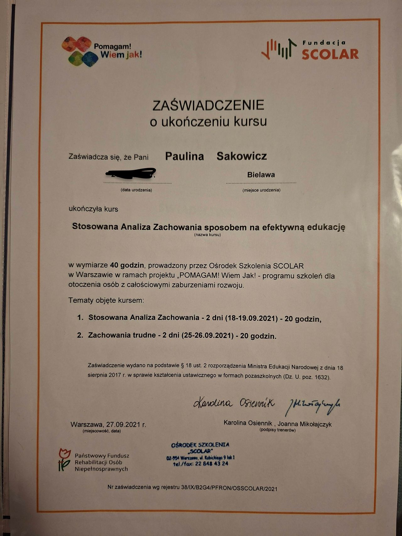 Jestem dyplomowanym psychologiem, absolwentem Uniwersytetu Wrocławskiego, gdzie ukończyłam studia na kierunku psychologia. Posiadam także podyplomowe wykształcenie z pedagogiki opiekuńczo-wychowawczej oraz z przygotowania pedagogicznego. W lipcu bieżącego roku kończę kolejne studia podyplomowe z zakresu komunikacji wspomagającej i alternatywnej (AAC). Ukończyłam również 3-modułowy kurs „Terapia behawioralna w teorii i praktyce” organizowany przez Polskie Stowarzyszenie Terapii Behawioralnej, który wzbogacił moją praktykę o konkretne strategie pracy z dziećmi z zaburzeniami rozwoju. Posiadam certyfikat terapeuty Treningu Umiejętności Społecznych, dzięki czemu wspieram dzieci w rozwoju kompetencji emocjonalno-społecznych. Jako psycholog stale rozwijam swoje kwalifikacje, aktywnie uczestnicząc w licznych kursach, szkoleniach i konferencjach.