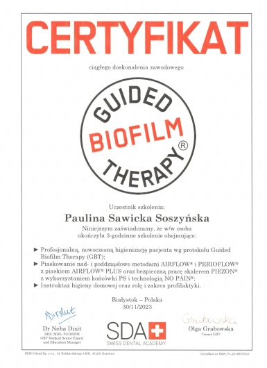 Jaki jest zakres porad oferowanych przez Paulina Sawicka-Soszyńska?Paulina Sawicka-Soszyńska to higienistka/higienista stomatologiczny. Na podstawie swojego doświadczenia i wykształcenia Paulina Sawicka-Soszyńska oferuje usługi takie jak: leczenie nadwrażliwości zębów, lakierowanie zębów, higienizacja, Guided Biofilm Therapy, profilaktyka próchnicy, Wybielanie zębów, fluoryzacja zębów, pakiet higienizacyjny z instruktażem, wybielanie zębów lampą, usuwanie kamienia nazębnego.