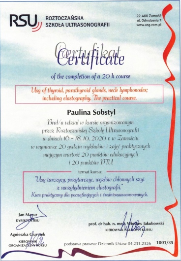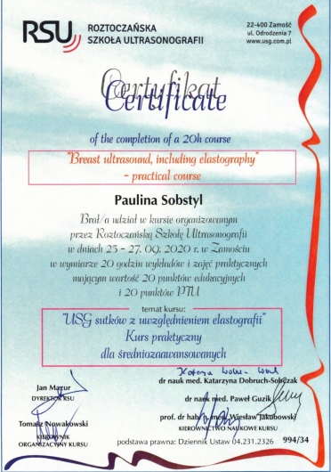 Potwierdzeniem jej wiedzy i kompetencji jest zdany European Diploma in Radiology (EDiR) – prestiżowy, międzynarodowy egzamin organizowany przez European Board of Radiology, będący dowodem posiadania umiejętności i wiedzy na najwyższym europejskim poziomie.