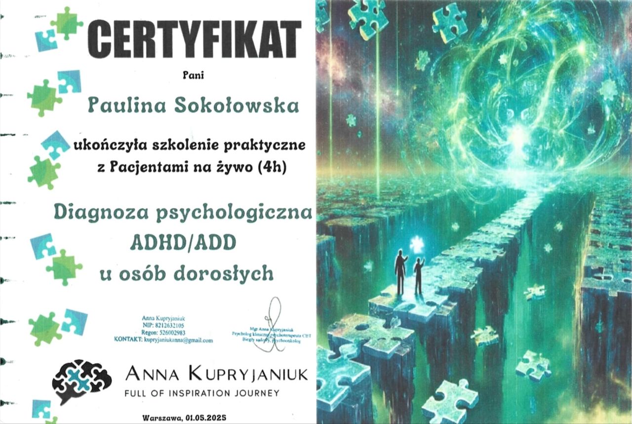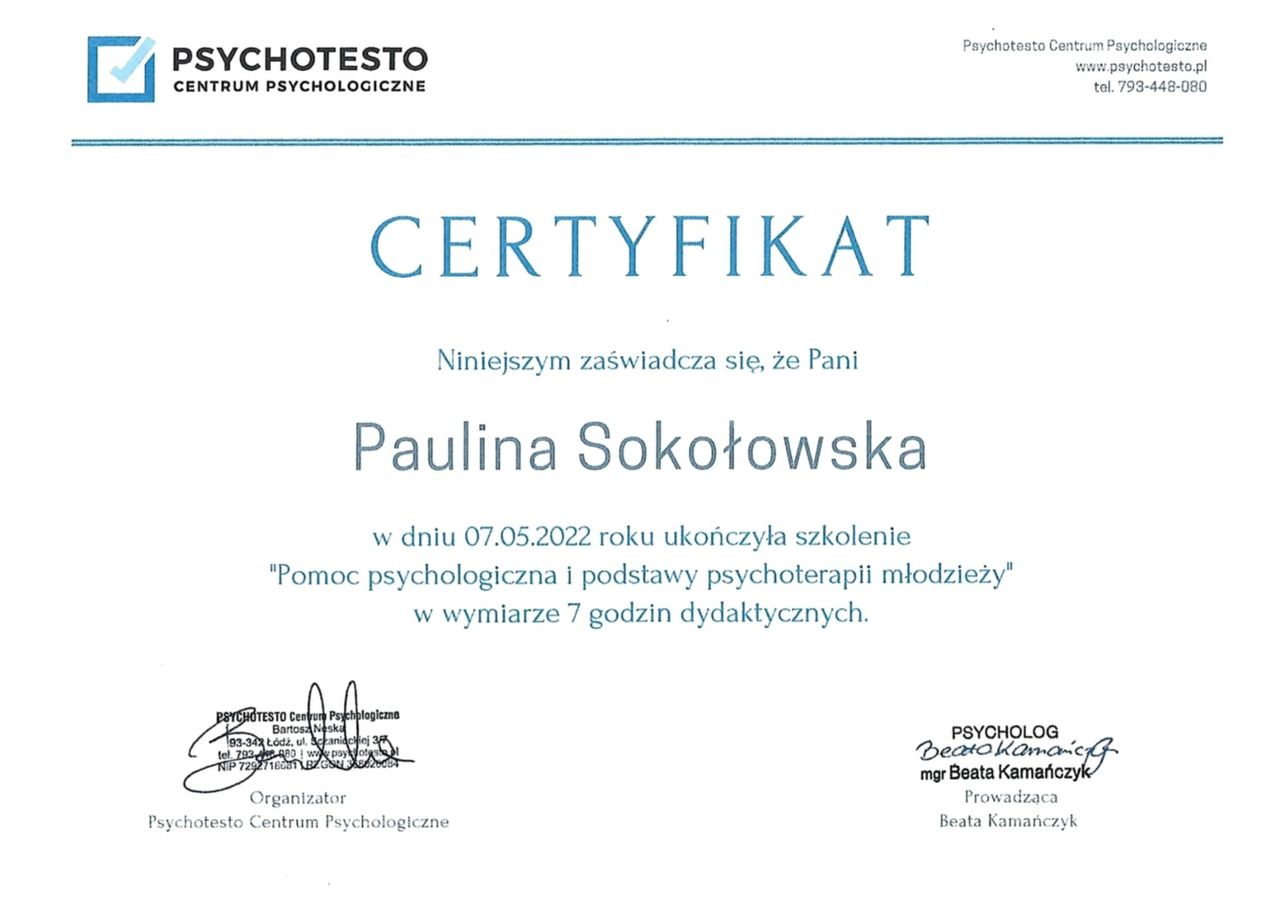 nazywam się Paulina Sokołowska i jestem dyplomowanym psychologiem o specjalności klinicznej, obecnie również w trakcie studiów podyplomowych przygotowujących do pracy nauczyciela.