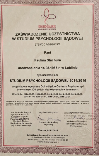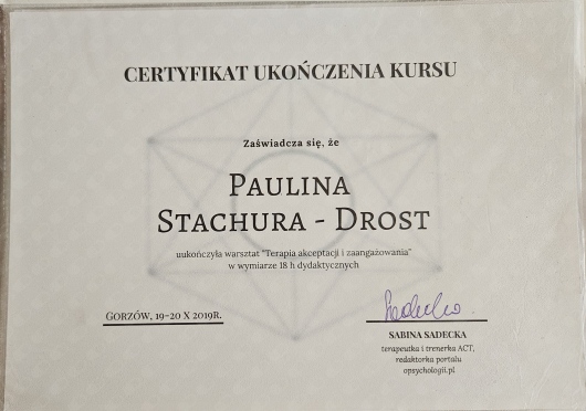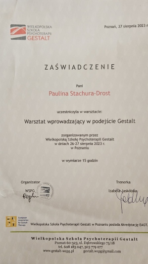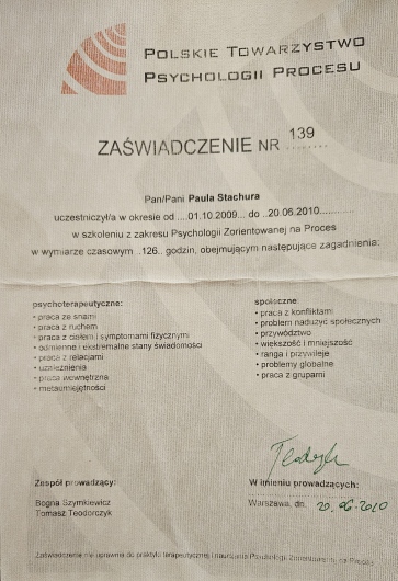 Pracuję z ciałem, umysłem i emocjami poprzez ruch, techniki uważnościowe, rozmowę terapeutyczną. Uważam, że ciało jest bardzo ważnym źródłem wiedzy o nas samych, a rozwój odbywa się poprzez świadome doświadczanie siebie w relacji – z drugim człowiekiem i ze światem. Moimi nadrzędnymi wartościami w kontakcie z drugim człowiekiem są szacunek i akceptacja. W swojej pracy nieustannie się rozwijam, szkolę i poszerzam swoje umiejętności aby jak najlepiej towarzyszyć Ci na Twojej drodze do życia w zgodzie z wartościami, które wyznajesz i w pełnej akceptacji dla jego cykliczności, zmienności tak aby wyzwania i trudności, a także lęk i cierpienie, nie stanowiły blokady przed życiem, jakie chcesz mieć. Pracuję w zgodzie z Kodeksem Etycznym zawodu psychologa, mam przebyte procesy psychoterapii własnej, swoją pracę superwizuję tak aby zapewniać Ci najwyższy komfort i bezpieczeństwo w procesie terapii.