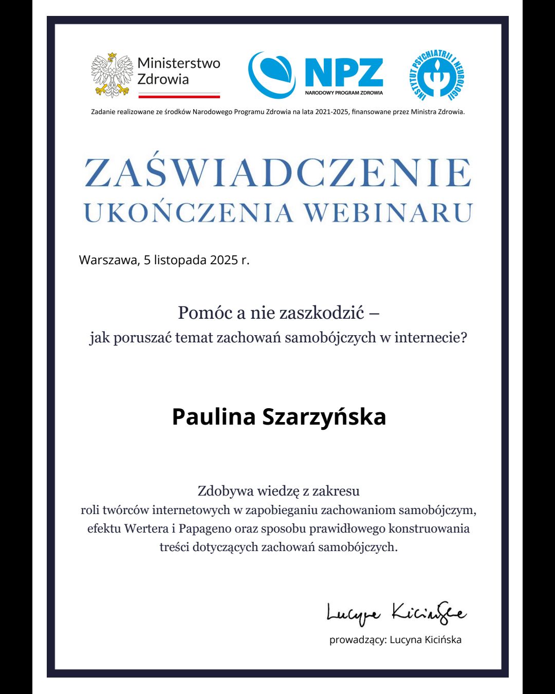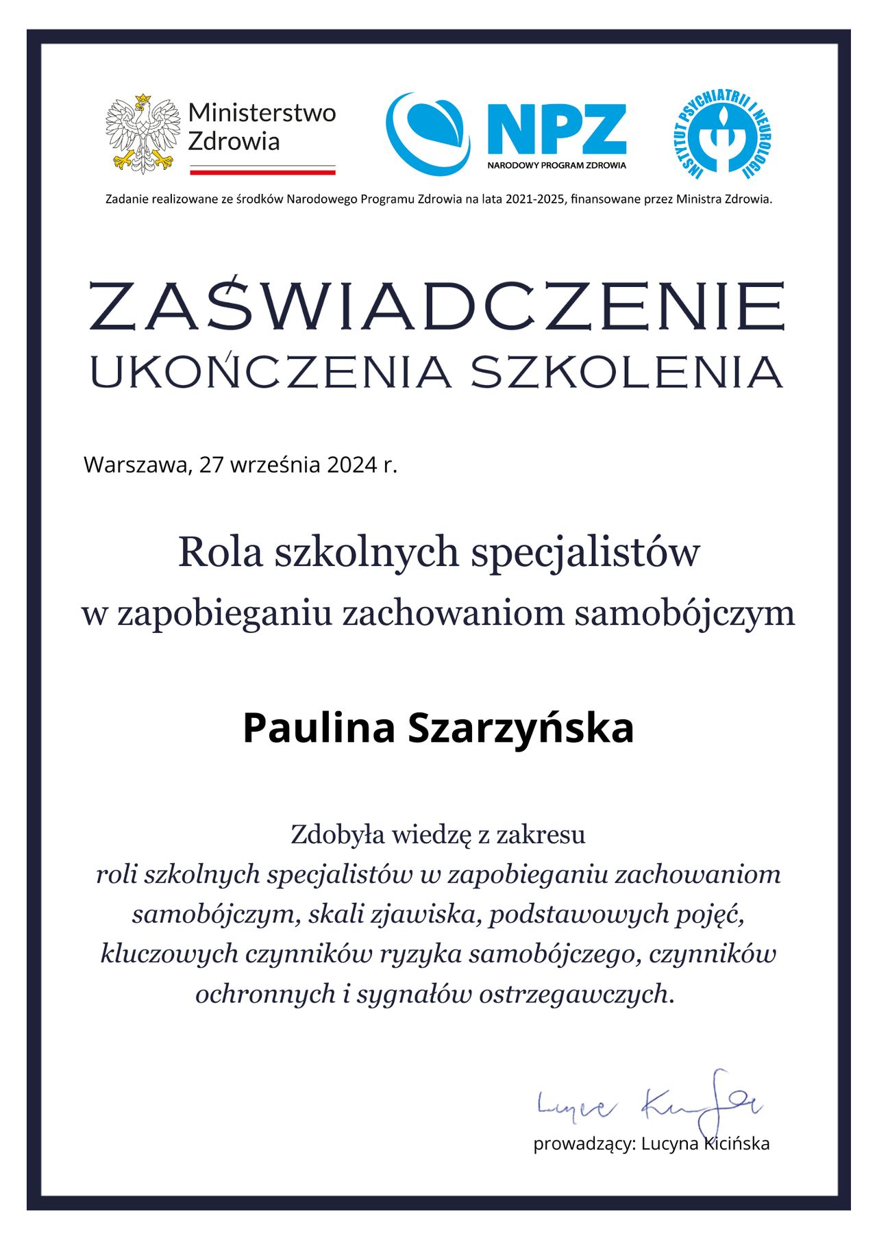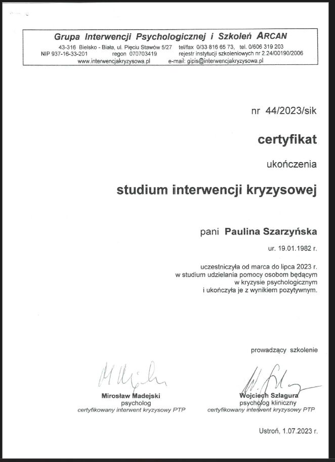 Jestem psychologiem, interwentem kryzysowym, suicydologiem, pedagogiem, oligofrenopedagogiem, ratownikiem medycznym i psychoterapeutą w trakcie 4 letniego kształcenia w zakresie psychoterapii poznawczo-behawioralnej w akredytowanej szkole psychoterapii Centrum CBT EDU (obecnie na II roku).