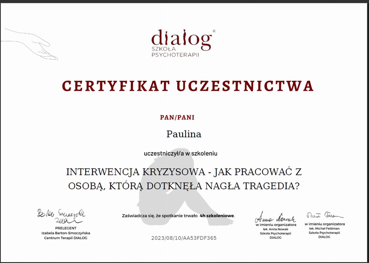 Dzięki spotkaniom z Panią Pauliną udało mi się uwierzyć w siebie, przezwyciężyć własne lęki i słabości. Podczas terapii Pani Paulina była jedną z niewielu osób, która wysłuchała, nie oceniała i potrafiła patrzeć z uśmiechem. Dziękuję za ten czas i pokazanie mi jak wiele znaczy gdy zgadzamy się z samym sobą.