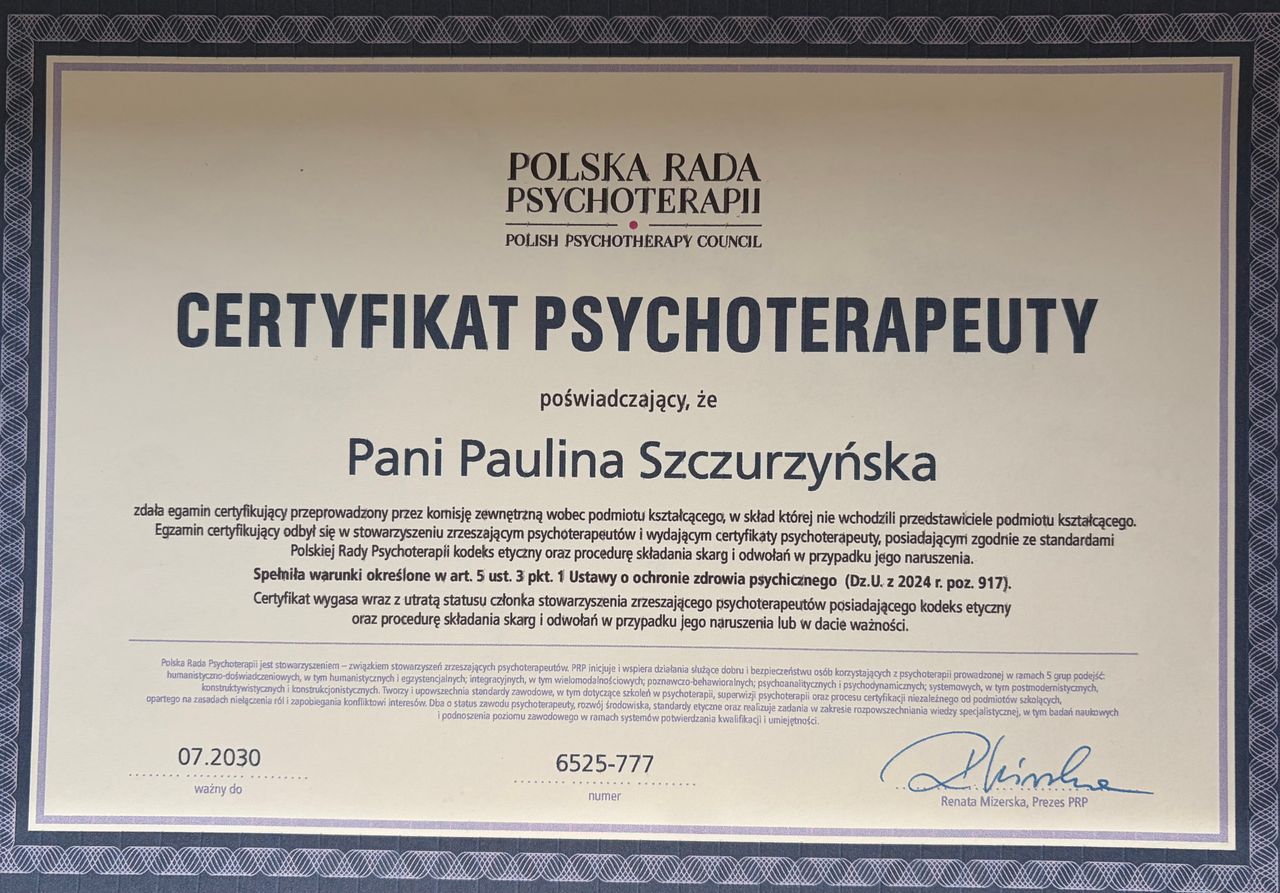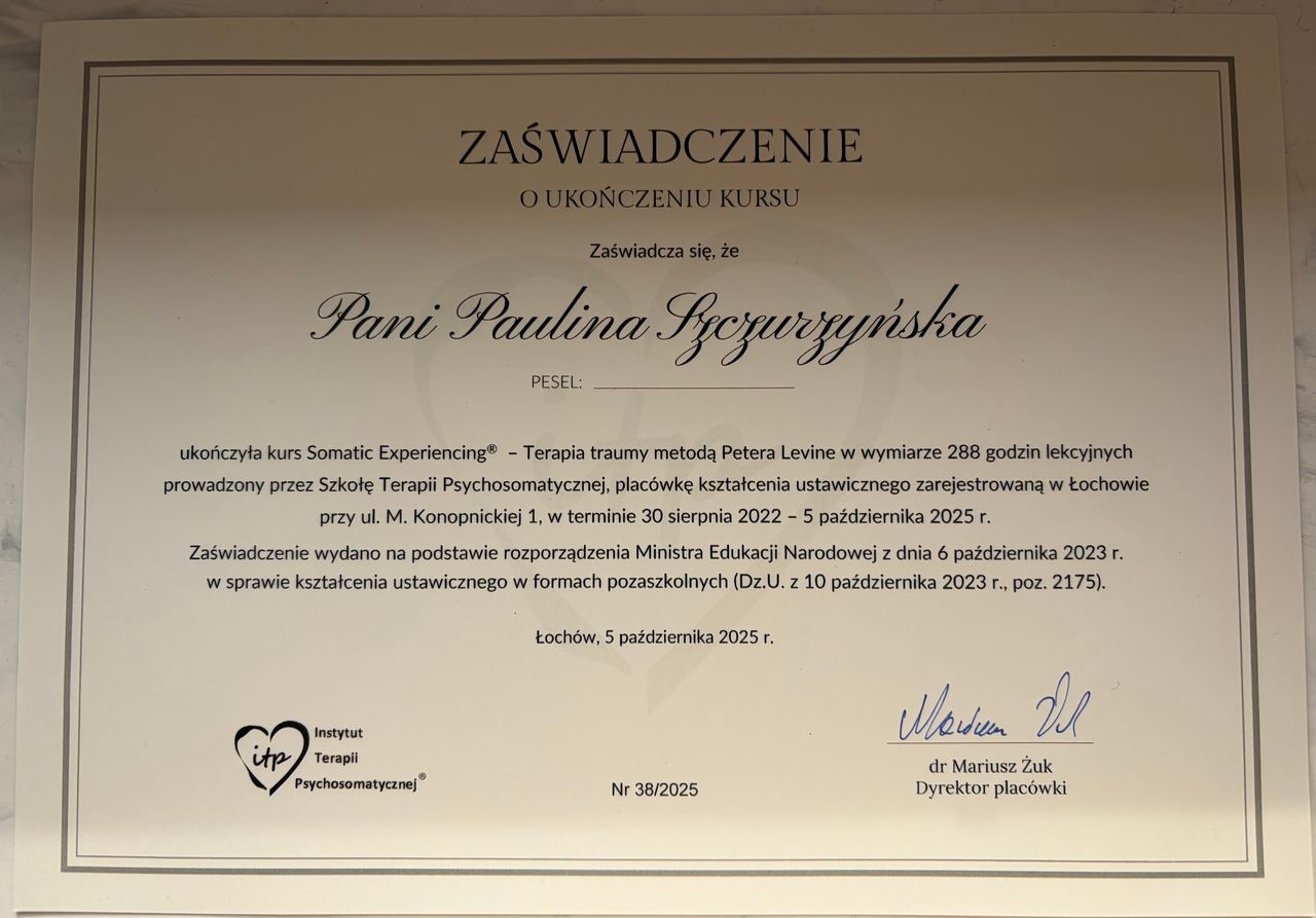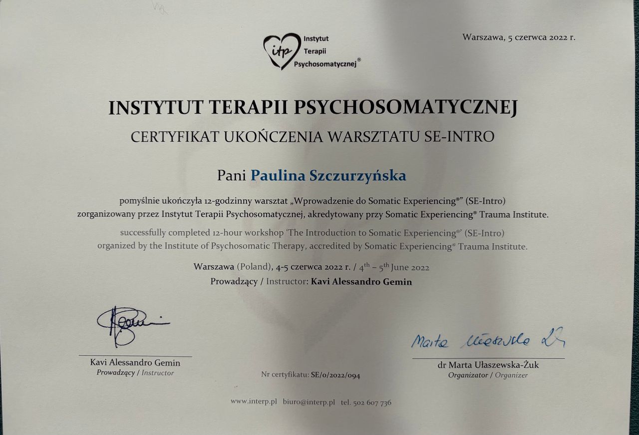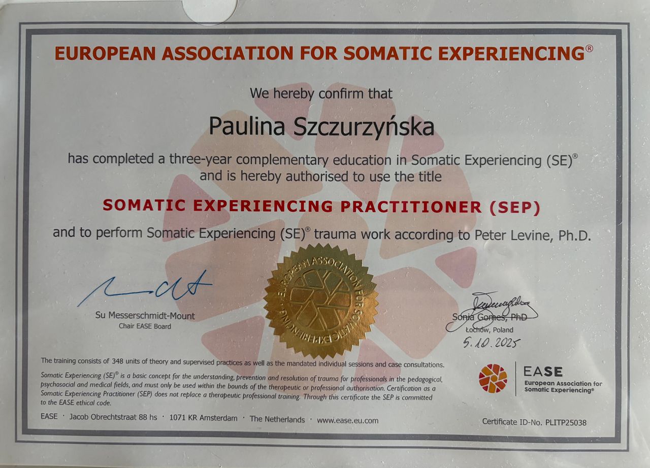 Witaj serdecznie, jestem psychologiem oraz certyfikowaną psychoterapeutką (Nr 120/T/2024) z ukończonym 4 letnim szkoleniem w Ośrodku Pomocy i Edukacji Psychologicznej INTRA w Warszawie oraz terapeutką traumy w nurcie Somatic Experiencing® (certyfikat nr PLITP25038).