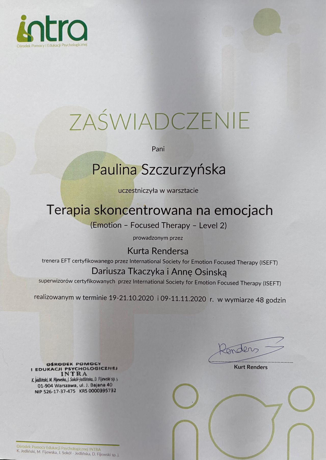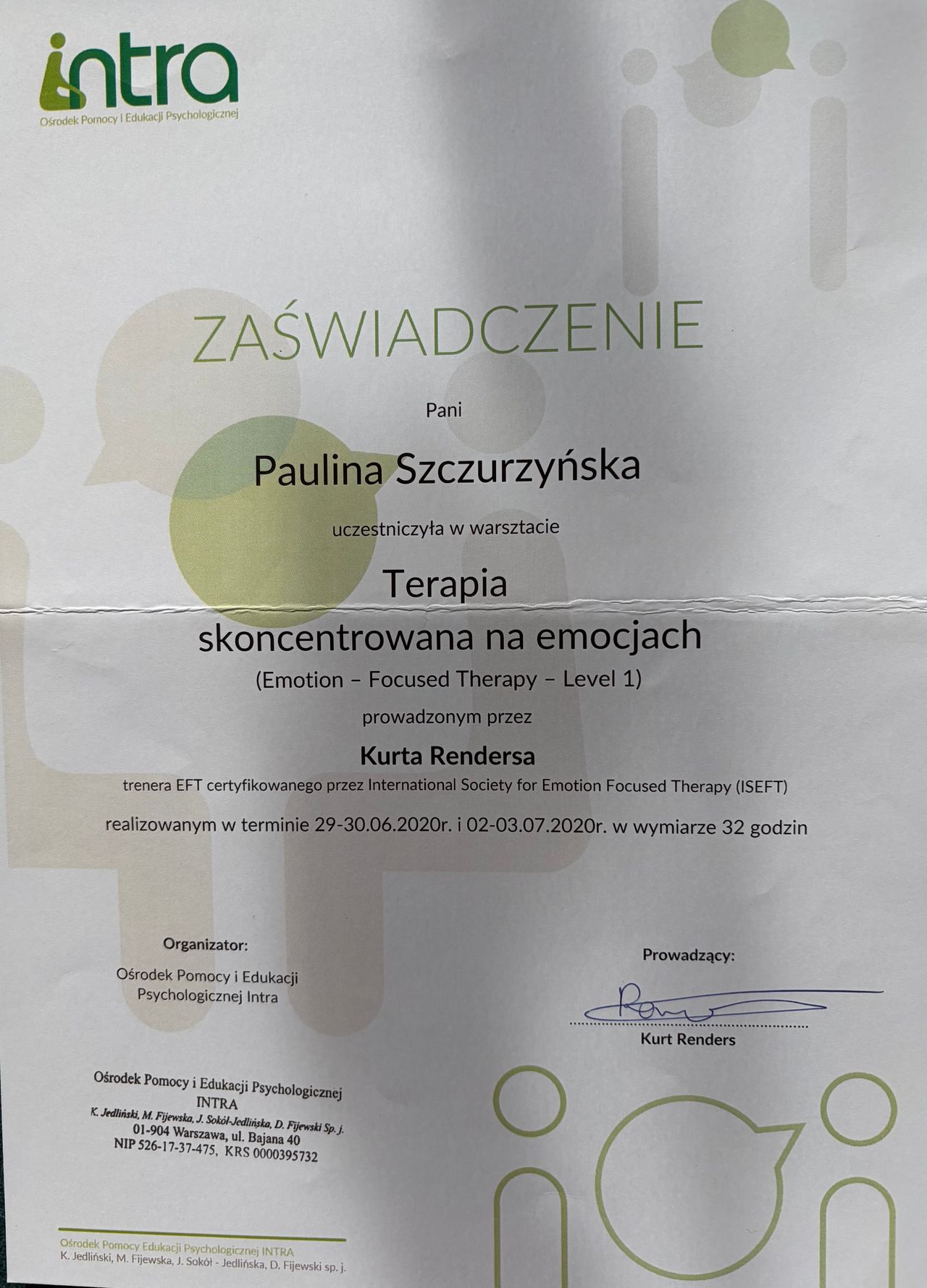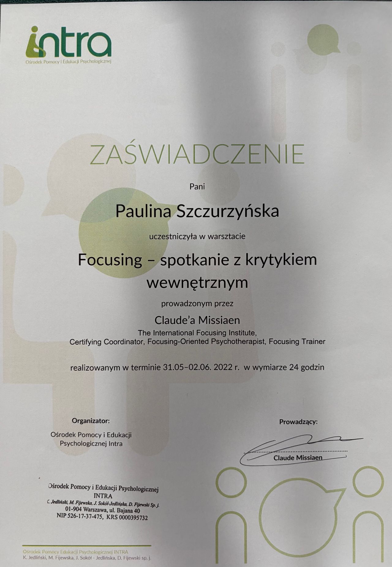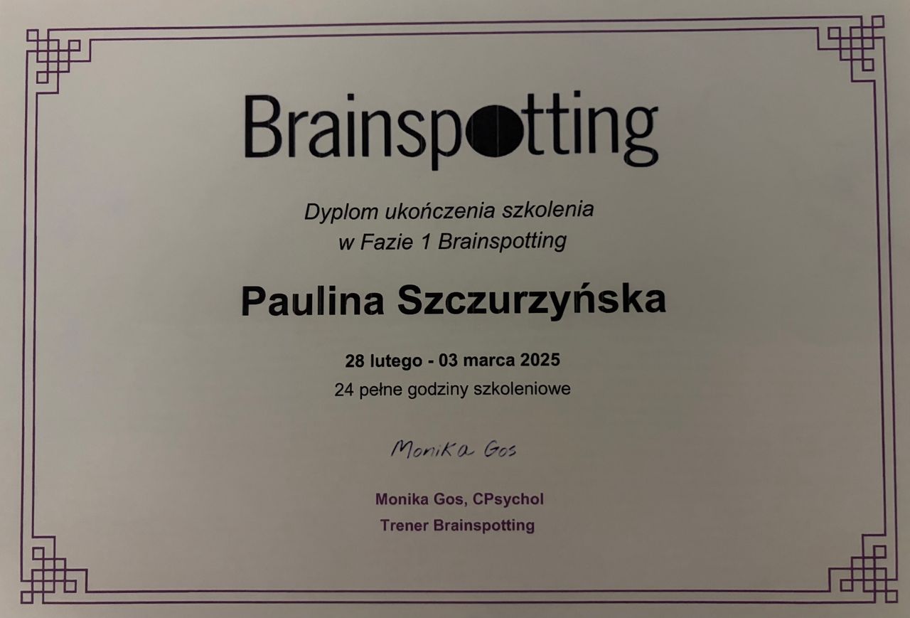 Witaj serdecznie, jestem psychologiem oraz certyfikowaną psychoterapeutką (Nr 120/T/2024) z ukończonym 4 letnim szkoleniem w Ośrodku Pomocy i Edukacji Psychologicznej INTRA w Warszawie oraz terapeutką traumy w nurcie Somatic Experiencing® (certyfikat nr PLITP25038).
