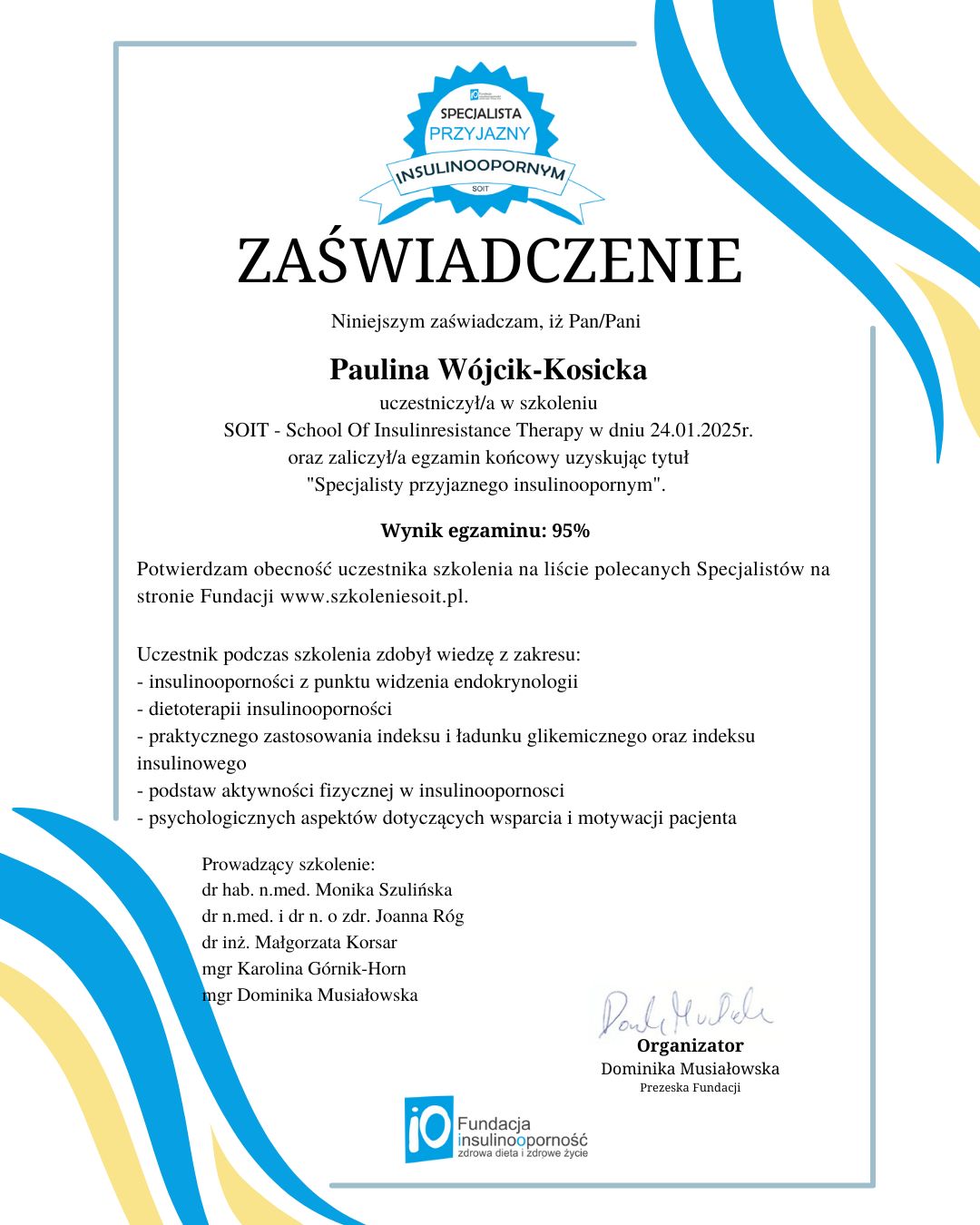 Spotkanie z Panią Pauliną to była jedna z najlepszych decyzji w moim życiu. Dzięki jej wsparciu udało mi się schudnąć aż 12 kg, a przy tym czułam się bezpiecznie, bo dieta była dostosowana do mojego karmienia piersią. Pani Paulina przygotowała dla mnie jadłospis, który był zdrowy, smaczny i różnorodny – nie miałam poczucia, że jestem „na diecie”. Co więcej, zawsze mogłam liczyć na jej cierpliwość, motywację i zrozumienie, szczególnie w chwilach zwątpienia. Dzięki niej zmieniłam podejście do jedzenia i dbania o siebie – czuję się lżejsza, silniejsza i szczęśliwsza. Z całego serca dziękuję i polecam Panią Paulinę każdej mamie, która chce zadbać o siebie i swoje zdrowie w tym wyjątkowym czasie.