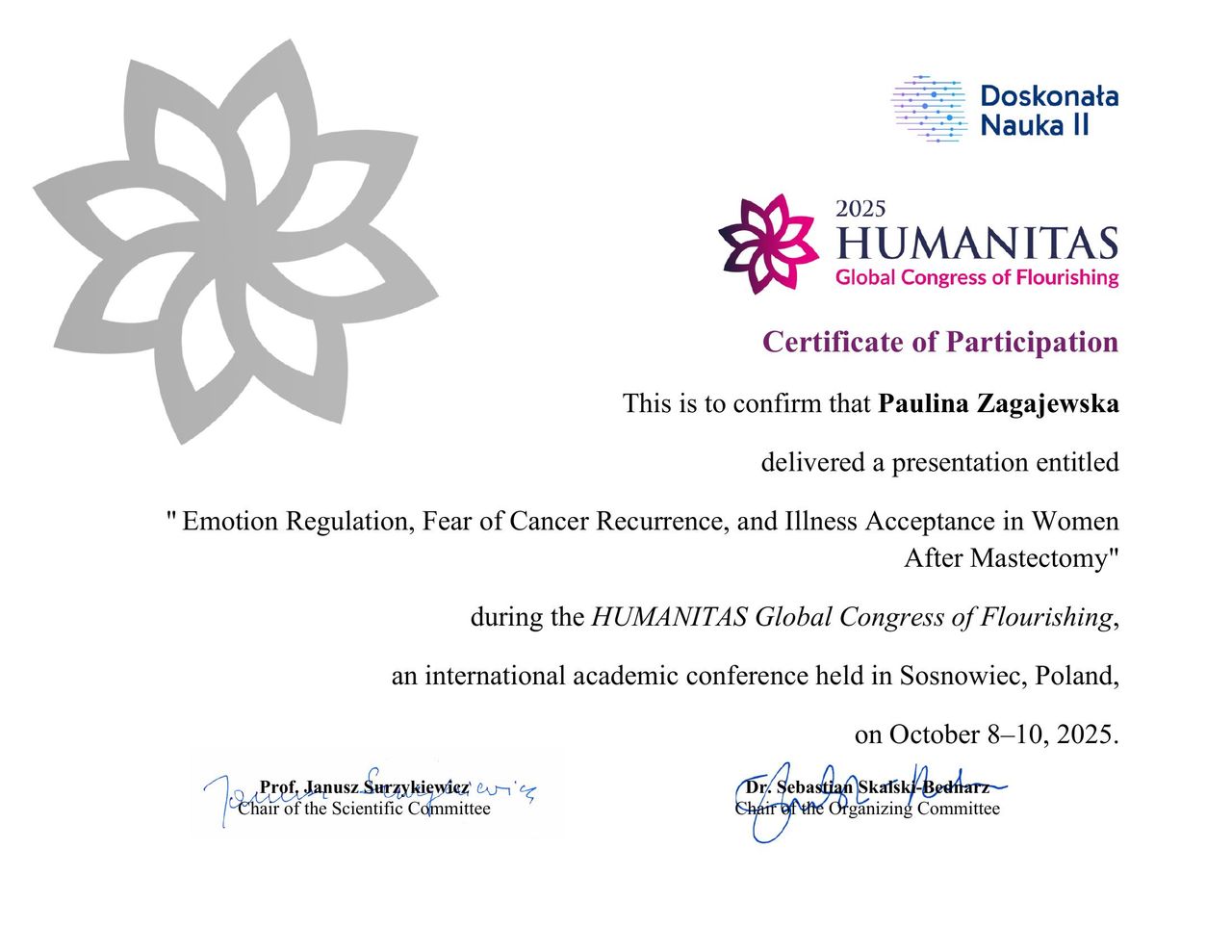 Tematem mojej pracy magisterskiej była „Regulacja emocji, lęk przed nawrotem choroby a akceptacja choroby u kobiet po mastektomii” – badanie, którego wyniki zostaną wkrótce opublikowane w czasopiśmie naukowym oraz wygłoszone na międzynarodowej konferencji naukowej. Tworząc badania do pracy magisterskiej, nawiązałam kontakt z setkami Amazonek – kobiet po mastektomii – co pozwoliło mi głębiej zrozumieć psychologiczne aspekty choroby nowotworowej oraz mechanizmy radzenia sobie w kryzysie zdrowotnym. Dzięki temu doświadczeniu mogłam zgłębić złożoność reakcji emocjonalnych i mechanizmów adaptacyjnych w chorobie nowotworowej, co stało się dla mnie cennym punktem odniesienia w pracy terapeutycznej.
