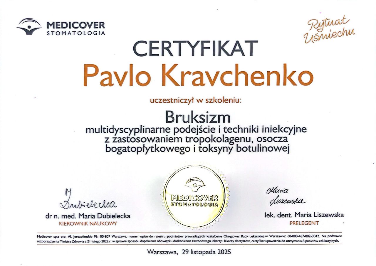 Jak Pavlo Kravchenko umawia wizyty?Pavlo Kravchenko używa kalendarza ZnanyLekarz, dlatego na stronie widzisz aktualne terminy. Wystarczy, że wybierzesz datę i godzinę, które odpowiadają Ci najbardziej. Umawianie wizyty jest darmowe, a tuż przed terminem wyślemy Ci przypomnienie.