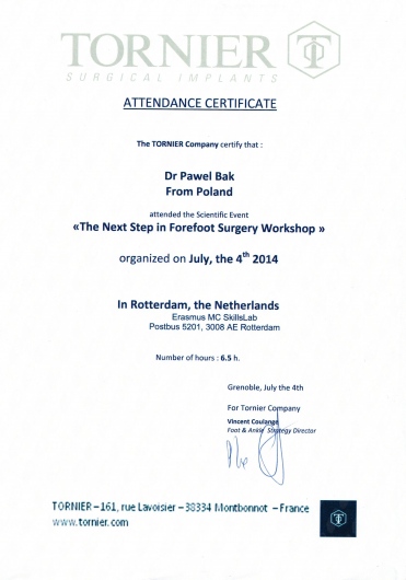 Po stażu podyplomowym specjalizował się na Oddziale Urazowo -Ortopedycznym Specjalistycznego Szpitala im. A. Sokołowskiego – Szczecin Zdunowo. 31.03.2014 r. uzyskał tytuł specjalisty w zakresie ortopedii i traumatologii narządu ruchu. Z Domem Lekarskim współpracuje od 2007 r., specjalizując się w chirurgii stopy i stawu skokowego. Od 2014 r. operuje także pacjentów po urazach na Oddziale Ortopedii w Szpitalu Powiatowym w Pyrzycach. Celem podniesienia kwalifikacji regularnie uczestniczy w wielu renomowanych kursach ortopedycznych w kraju i za granicą, między innymi we Włoszech, Francji, Szwajcarii, Holandii, Norwegii.