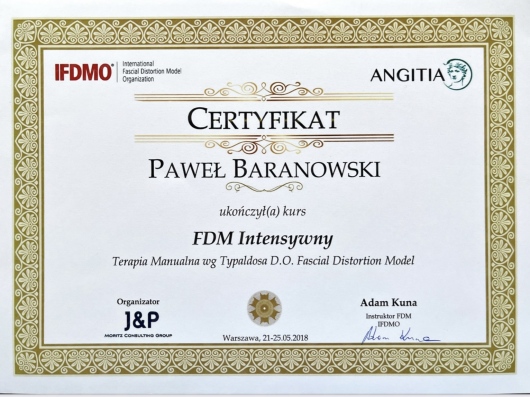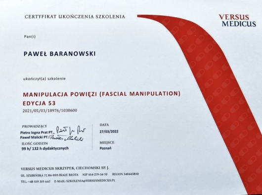 Jestem jedynym terapeutą w okolicach Legionowa posiadającym trzeci – najwyższy – poziom certyfikacji Fascial Manipulation® (metoda Stecco). To zaawansowana i precyzyjna technika pracy z układem powięziowym, która pozwala dotrzeć do głębokich przyczyn dolegliwości związanych m.in. z układami: trawiennym, moczowo-płciowym, hormonalnym czy oddechowym – czyli obszarami, których pacjenci często nie kojarzą z fizjoterapią, a które mogą mieć swoje źródło w zaburzeniach powięziowych.