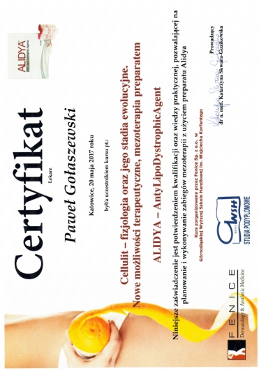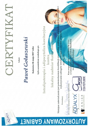 Kładę duży nacisk na samokształcenie. Posiadam liczne certyfikaty m.in. do wykonywania badań USG jamy brzusznej oraz naczyń krwionośnych Polskiego Towarzystwa Ultrasonografii. Stale aktualizuję i poszerzam swoje kwalifikacje uczęszczając na konferencje naukowe, kursy, oraz szkolenia w wiodących ośrodkach w polsce i za granicą, by móc świadczyć usługi medyczne na jak najwyższym poziomie.