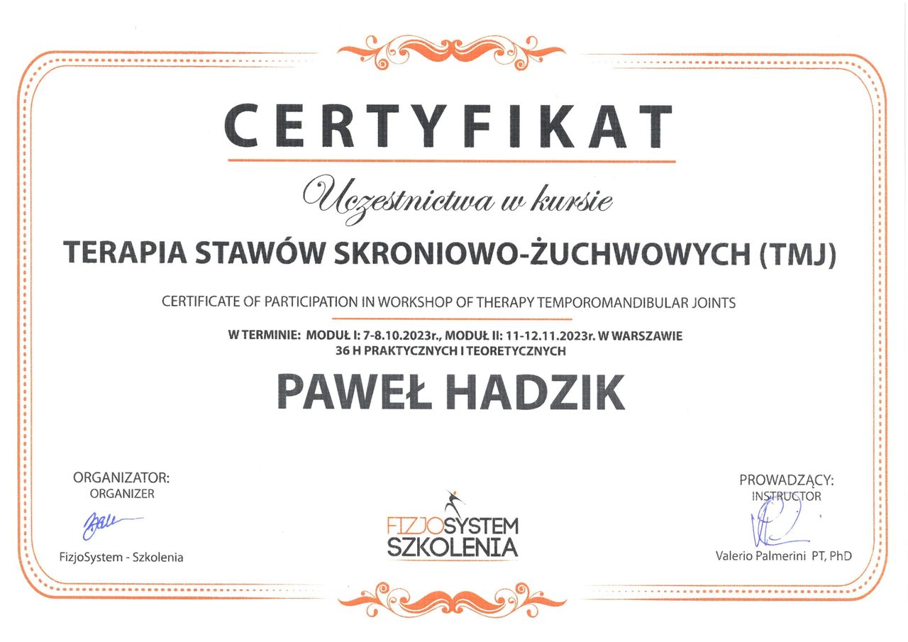 Jaki jest zakres porad oferowanych przez Paweł Hadzik?Paweł Hadzik to fizjoterapeuta. Na podstawie swojego doświadczenia i wykształcenia Paweł Hadzik oferuje usługi takie jak: konsultacja fizjoterapeutyczna, fizjoterapia stomatologiczna, rehabilitacja sportowców, rehabilitacja stomatologiczna, Rehabilitacja stawów skroniowo-żuchwowych, napięciowe bóle głowy, terapia stawów skroniowo-żuchwowych, terapia manualna wg standardów IFOMPT, pierwsza wizyta (konsultacja + sesja fizjoterapeutyczna), sesja fizjoterapeutyczna.