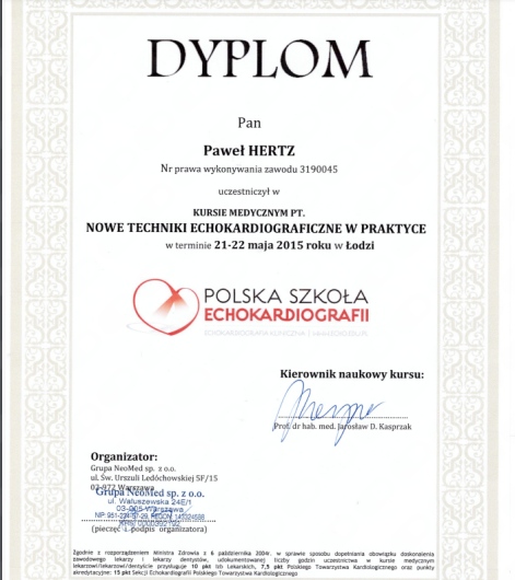 Jaki jest zakres porad oferowanych przez Paweł Hertz?Paweł Hertz to kardiolog. Na podstawie swojego doświadczenia i wykształcenia Paweł Hertz oferuje usługi takie jak: konsultacja internistyczna (pierwsza wizyta), 48-godzinna rejestracja EKG met. Holtera, konsultacja kardiologiczna, USG doppler tętnic szyjnych i kręgowych, USG, USG z dopplerem żył kończyn dolnych, holter EKG 3-dniowy, Holter EKG 7-dniowy, Holter EKG, ECHO serca.