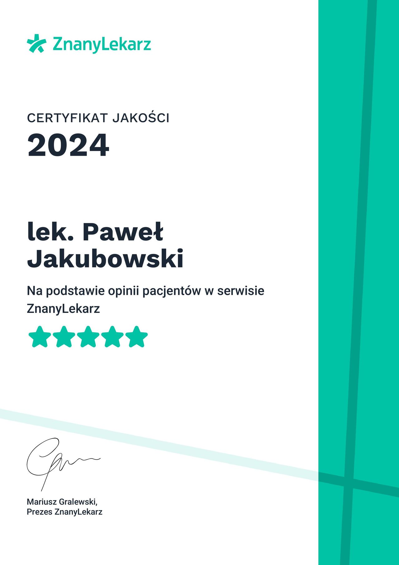 Jak Paweł Jakubowski umawia wizyty?Paweł Jakubowski używa kalendarza ZnanyLekarz, dlatego na stronie widzisz aktualne terminy. Wystarczy, że wybierzesz datę i godzinę, które odpowiadają Ci najbardziej. Umawianie wizyty jest darmowe, a tuż przed terminem wyślemy Ci przypomnienie.